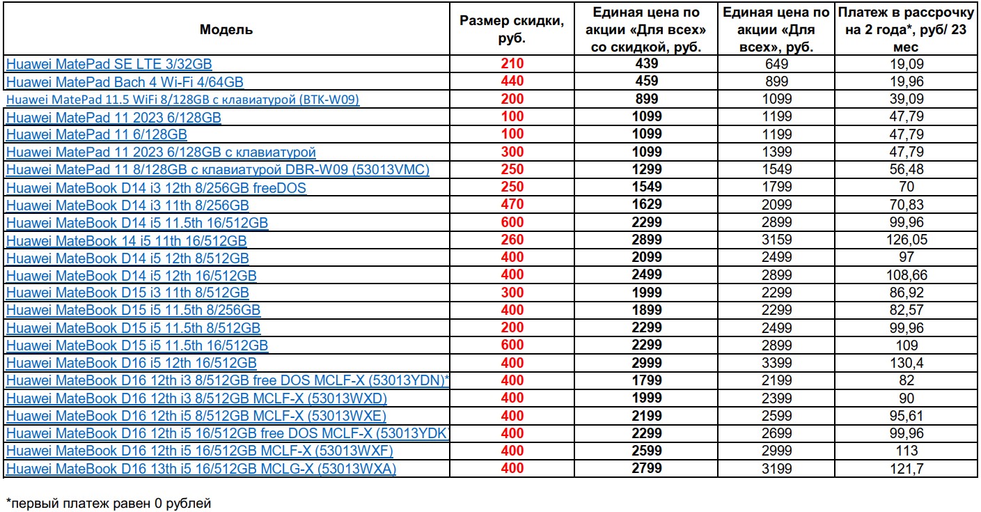 Весь перечень моделей планшетов и ноутбуков HUAWEI со скидками представлен ниже: