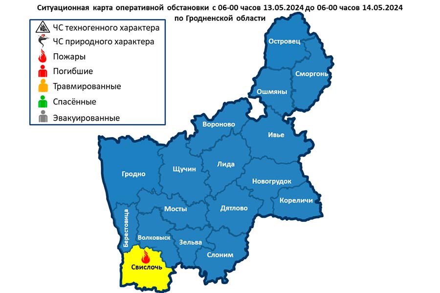 13.05.2024 в 16-39 поступило сообщение пожаре жилого дома в д. Рудня Свислочского района. В результате повреждены стены, перекрытие, имущество в доме. Причина пожара устанавливается.