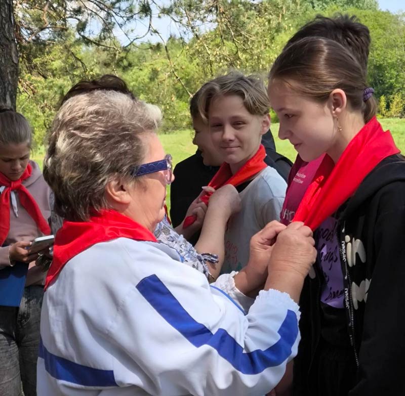В торжественной обстановке, под песню «Взвейтесь кострами синие ночи» – гимн советской пионерии, – представители старшего поколения повязали алые галстуки своим юным друзьям, которые, вступая в ряды детской организации, поклялись с гордостью и честью носить звание «Пионер XX столетия».