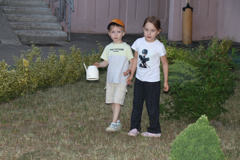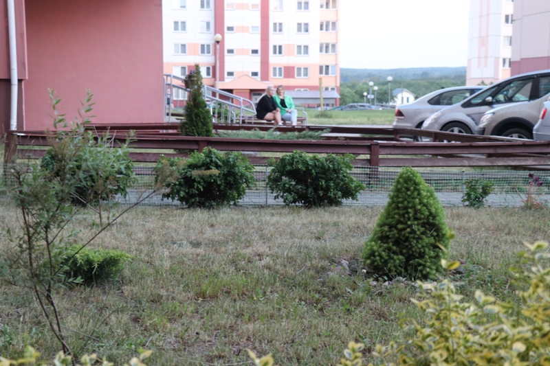 Летом здесь не ждут, когда работники ЖКХ скосят траву – косят и убирают ее сами, подстригают кусты на газоне, который разбили несколько лет назад, а затем засадили декоративными деревцами и кустарниками. Чтобы сохранить растения в сильную жару, жители поливают их. Для этого специально приобрели шланг.