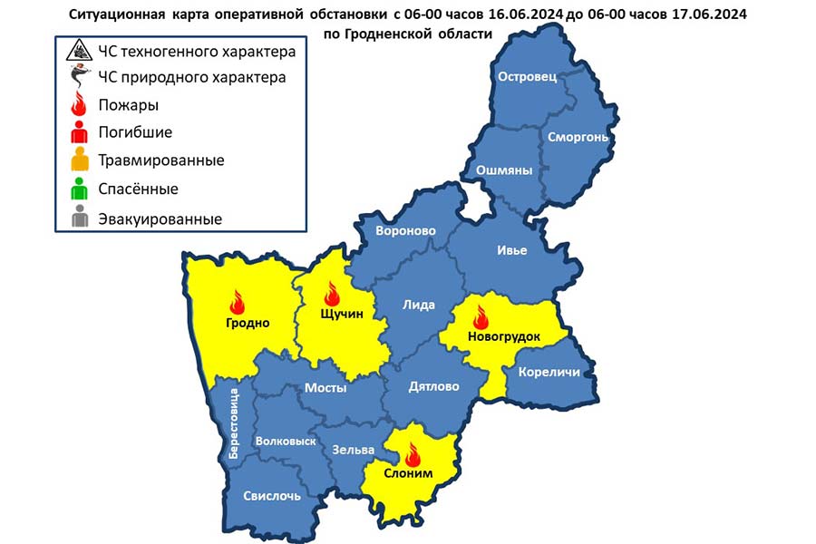 16.06.2024 в 22-20 поступило сообщение о пожаре жилого дома в г. Щучин по ул. Набережной. В результате повреждено перекрытие, закопчены стены, потолок и имущество в жилой комнате. Причина пожара устанавливается.