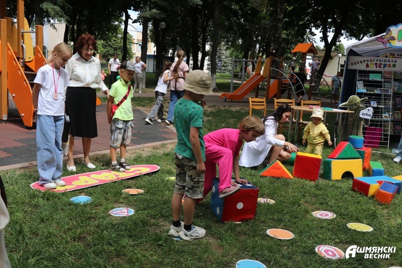 В городском парке работала детская интерактивная площадка «Мирное детство» для самых маленьких жителей города. Здесь развлечения для детей подготовили работники Ошмянской районной библиотеки и развлекательного центра «Джунгли».