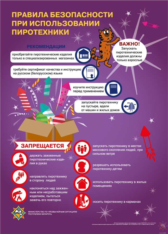 Как рассказал старший инспектор сектора пропаганды Ошмянского РОЧС Михаил Марковский, запуская пиротехнику, не стоит надеяться на свои знания из прошлого. Необходимо прочитать инструкцию: у каждого изделия свои особенности. Для запуска нужна открытая площадка, свободная от строений, деревьев, легковоспламеняющихся предметов. Важные условия – безветренная погода и расстояние до линий электропередач – 30 метров и более. Зрителям нужно отойти на расстояние, указанное в инструкции. Поджигать фитиль следует на расстоянии вытянутой руки. При этом не стоит направлять салют в сторону людей. Если же пиротехника не сработала – не нужно поджигать ее снова, а также наклоняться над ней, чтобы выяснить, что случилось.