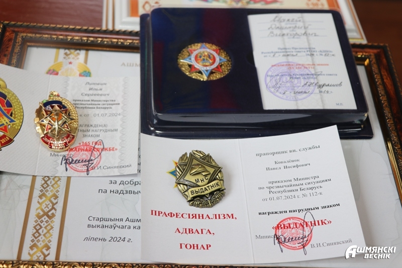 Нагрудным знаком Министерства по чрезвычайным ситуациям Республики Беларусь «Выдатнiк» отмечена безукоризненная работа старшего инструктора-спасателя ПАСП-12 Павла Коваленка, водителя ПАСП-12 Андрея Фальковского.