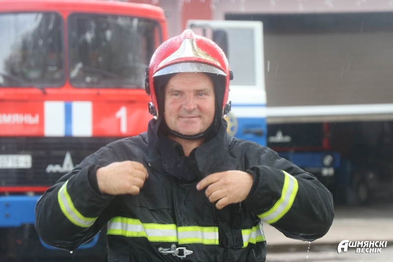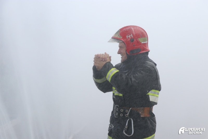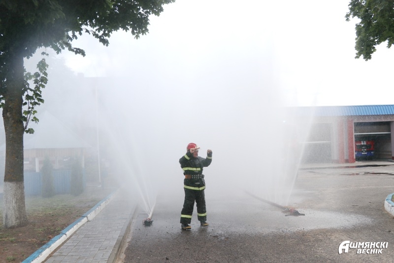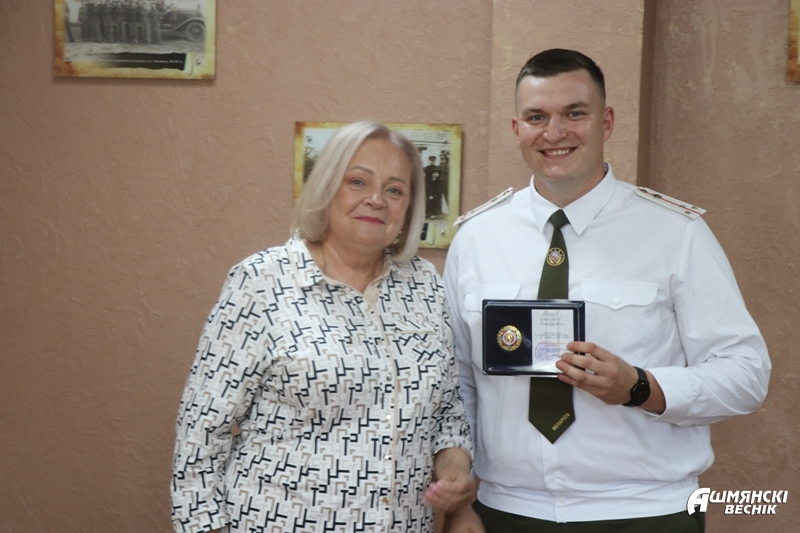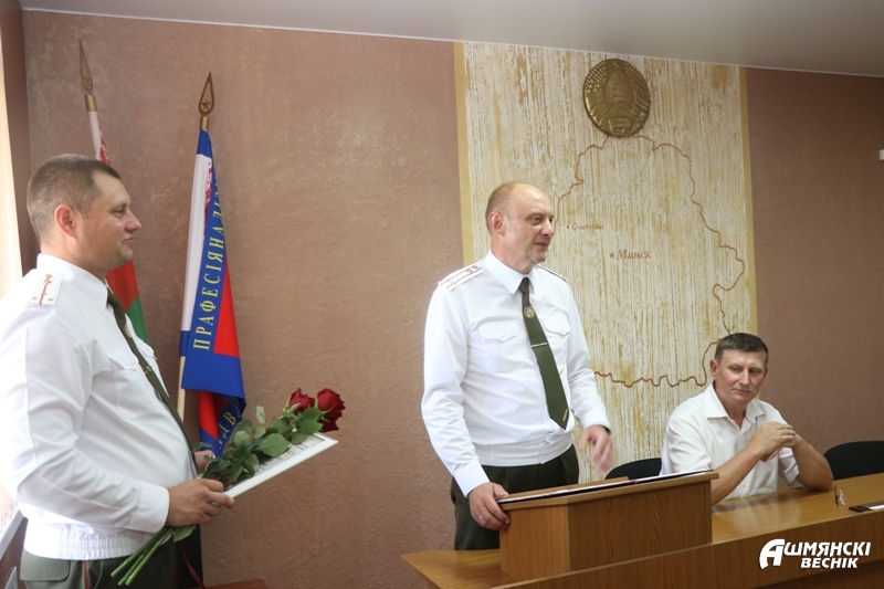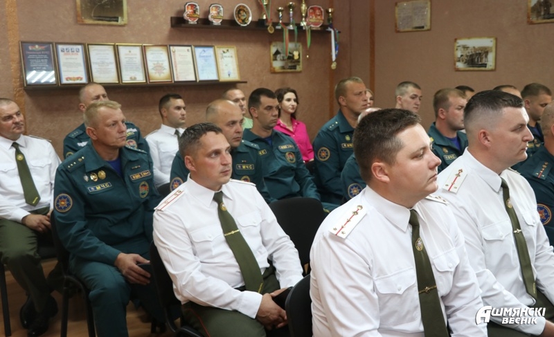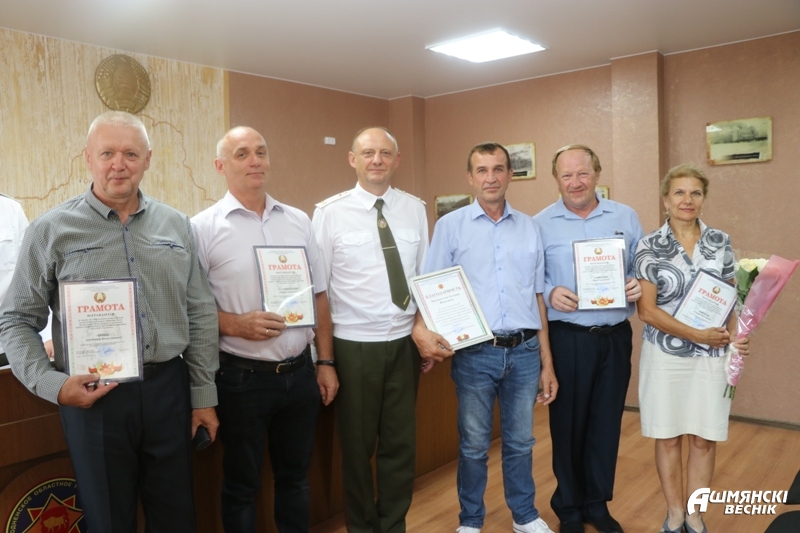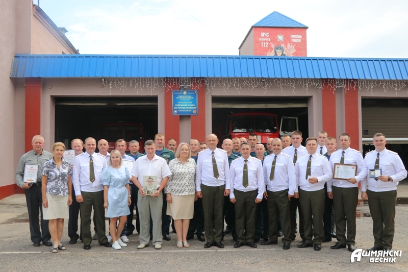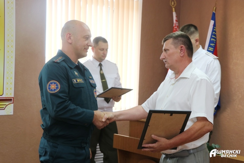 Успехов в нелегком труде пожелала своим коллегам начальник Ошмянского производственного участка Гродненского областного комбината противопожарных работ Янина Кащиц и вручила нагрудный знак республиканского общественного объединения «Белорусское добровольное пожарное общество» «За заслуги» инспектору сектора надзора и профилактики Дмитрию Макею.