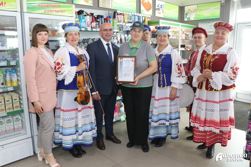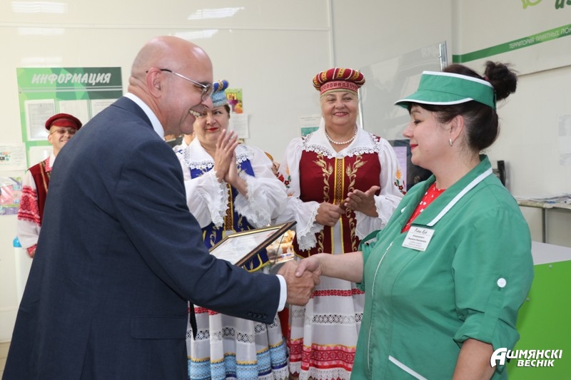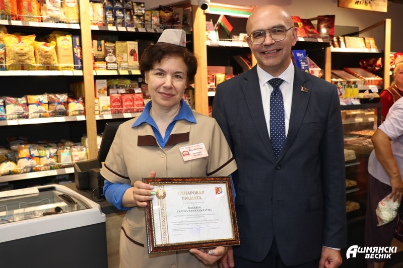 Первым в списке оказался магазин «Пачастунак» по ул. Советской, 127. Магазин распахнул свои двери для покупателей больше года назад, но уже успел полюбиться горожанам и стать одним из лучших торговых объектов нашего города. Как известно, в лучшем магазине трудятся только лучшие специалисты. Возглавляет магазин Галина Ромуальдовна Яцкевич. Коллеги Галины характеризуют женщину только с хорошей стороны: она умеет находить общий язык с каждым продавцом, а к своим обязанностям относится ответственно и щепетильно. Юрий Снесарь поблагодарил работницу за добросовестный труд и наградил почетной грамотой Ошмянского районного исполнительного комитета. Юрий Владимирович пожелал достигать новых высот в трудовой деятельности и получать радость от каждого рабочего дня.