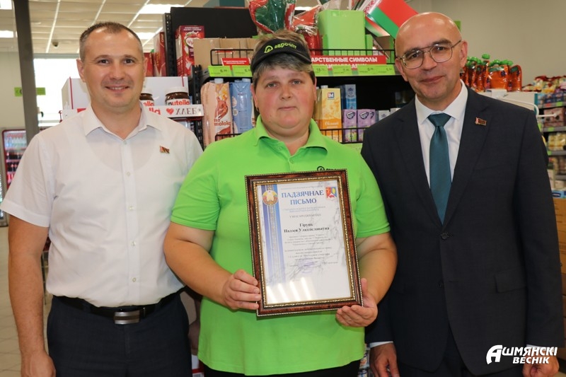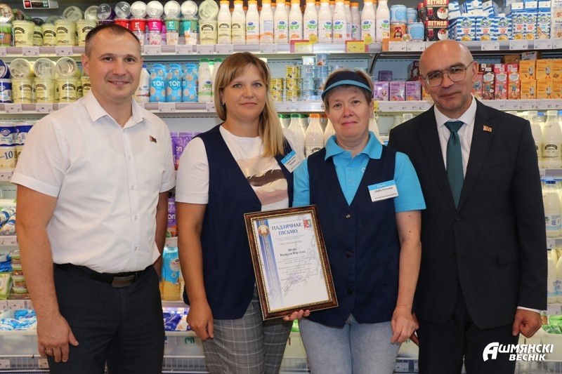 За добросовестный труд, высокий профессионализм и в связи со 100-летием образования органов торговли Беларуси благодарственным письмом председателя Ошмянского райисполкома награждена Людмила Алексеева, директор магазина «Евроопт». Благодарственное письмо получила также Надежда Гируть, продавец 5 разряда. Отличились и работники магазина «Санта-90». Контролеру-кассиру Наталье Шуба в торжественной обстановке было вручено благодарственное письмо. Заместитель председателя Ошмянского райисполкома Юрий Снесарь и начальник отдела экономики Сергей Милевич пожелали женщине дальнейшего профессионального роста и развития. Наталья отметила, что это не первая награда в ее копилке, а также подчеркнула, что такие моменты стимулируют к дальнейшему плодотворному труду.
