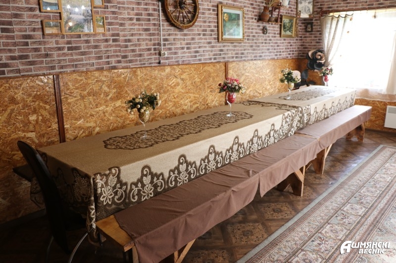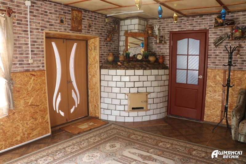 Унутры дома адчуваецца незвычайная лёгкасць. У спякотнае надвор’е тут асабліва добра адпачыць. Гаспадыня дома адзначае, што госці, якія прыязджаюць сюды ўпершыню, захапляюцца цудоўнай вясковай атмасферай. Іх прываблівае просты драўляны дом і самабытны інтэр’ер. Банкетная зала сустракае ўтульнасцю і гармоніяй. Масіўны дубовы стол, камін з аўтэнтычнымі рэчамі, якія перайшлі ў спадчыну гаспадарам, адмысловыя жырандолі — усё гэта стварае адчуванне спакою і радасці.
