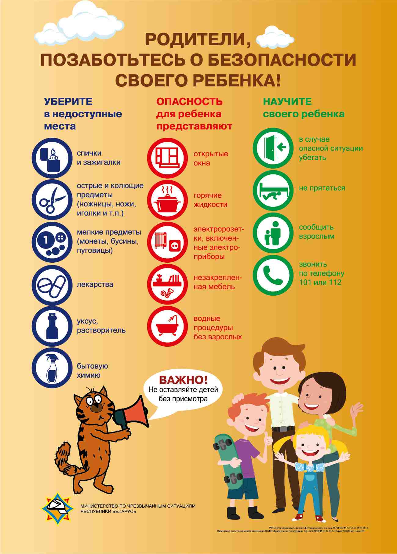 Храните спички, зажигалки в недоступных для детей местах. Не разрешайте детям самостоятельно пользоваться газовыми и электрическими приборами, топить печи. Объясните ребенку, что в случае возникновения пожара необходимо выбегать на улицу и ни в коем случае не прятаться. Не запугивая ребенка, расскажите правила безопасности и «проиграйте» различные ситуации. Выучите с ребенком домашний адрес и номер телефона, чтобы при необходимости он мог сам обратиться за помощью в службу спасения. Возле телефона на листе бумаги напишите номера экстренных служб, и объясните ребенку при каких обстоятельствах ими можно воспользоваться (101 или 112 – дежурная служба МЧС, 102 – милиция, 103 – скорая медицинская помощь).
