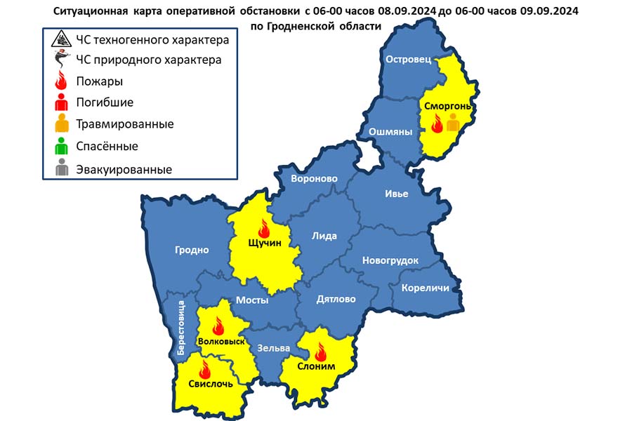 08.09.2024 в 21-06 поступило сообщение о пожаре хозяйственной постройки в г. Сморгонь по ул. Приозерной. В результате уничтожена кровля, повреждены стены, имущество в хозяйственной постройке, а также уничтожена рядом расположенная деревянная беседка. При самостоятельном тушении пожара получила термические ожоги хозяйка. Причина пожара устанавливается.