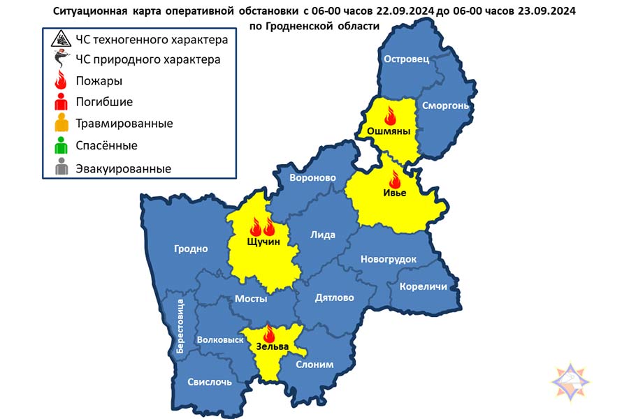 22.09.2024 в 12-58 поступило сообщение о пожаре в квартире в г.п.Зельва по ул.Шоссейной. В результате повреждено имущество в помещении кухни, закопчены стены. Причина пожара устанавливается.
