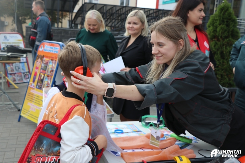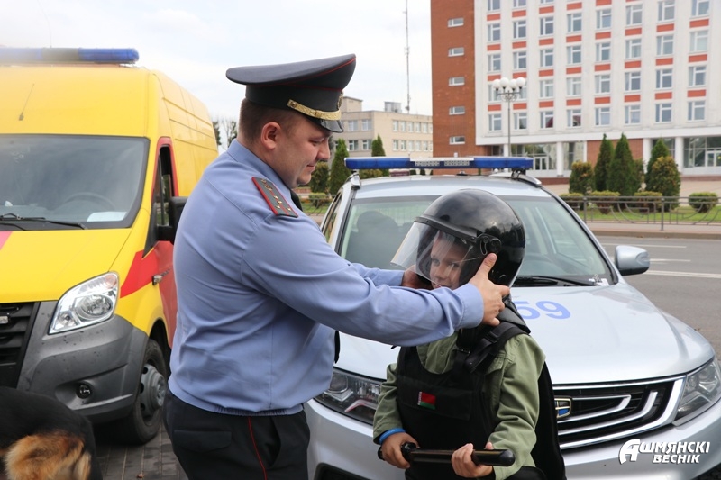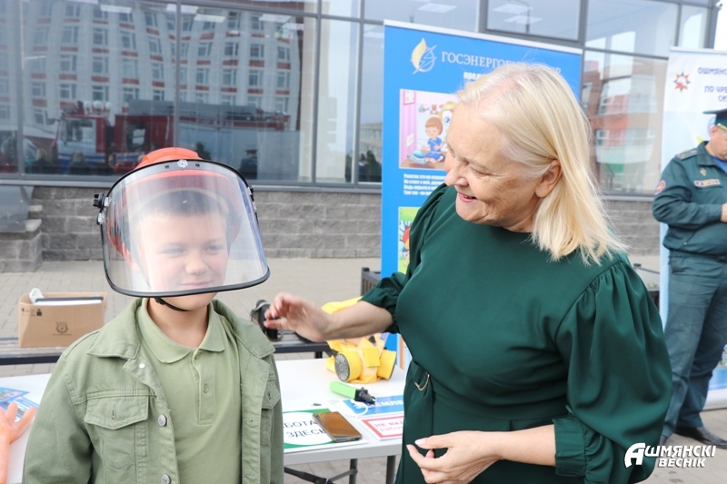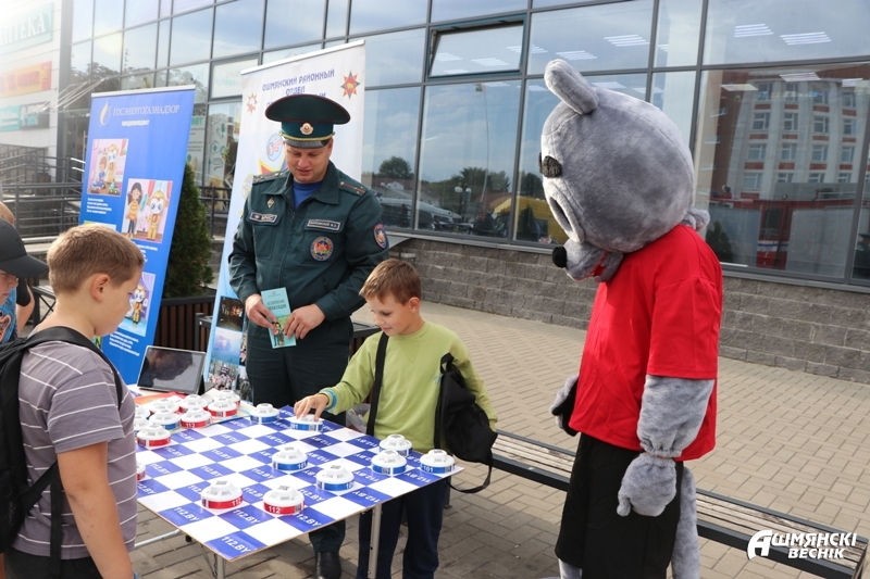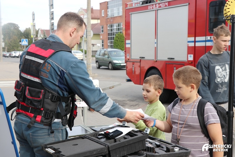 У работников каждой из них можно было узнать много полезной информации, а к тому же получить неожиданные подарки: наглядно-изобразительную продукцию и канцелярские принадлежности. На площадке РОЧС дети с удовольствием играли в «безопасные» шашки, в роли которых выступили автономные пожарные извещатели. Как вести себя в различных чрезвычайных ситуациях, рассказал детям старший инспектор сектора пропаганды и взаимодействия с общественностью Ошмянского РОЧС Михаил Марковский. На площадке Ошмянской структуры БДПО пользовались популярностью автономные пожарные извещатели – их можно было приобрести прямо на месте. Работники энергогазинспекции предлагали примерить используемую в работе спецодежду и напоминали детям об опасности, которую таит электрический ток. Специалисты газоснабжающей организации обратили внимание на недопущение нарушения правил пользования газом в быту. Сотрудники правоохранительных органов рассказали о том, как обезопасить себя от преступных посягательств, а также продемонстрировали элементы используемой в службе спецодежды. С интересом наблюдал за происходящим служебный пес Рэм.