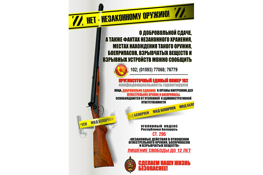 По вопросам сдачи незаконно хранящегося оружия, боеприпасов, взрывчатых веществ и взрывных устройств или о месте их нахождения можно обратиться в Ошмянский РОВД лично или позвонить по телефонам горячей линии: 77335 (факс), 8 (029) 35-31-442 или 102.