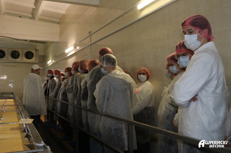 Вторым пунктом в маршрутном листе стал Ошмянский сыродельный завод. Перед входом в цеха ребятам предстояло надеть специальную форму. Специалисты показали весь процесс создания сыра. Больше всего участников экскурсионной группы заинтересовал этап созревания сыра. Не менее интересной оказалась и упаковка. Ребята увидели, что все процессы на предприятии автоматизированы. Живой интерес вызвала и готовая продукция. Специалисты рассказали, что наши сыры пользуются популярностью не только в Беларуси, но и за ее пределами.