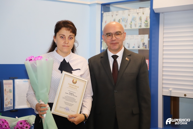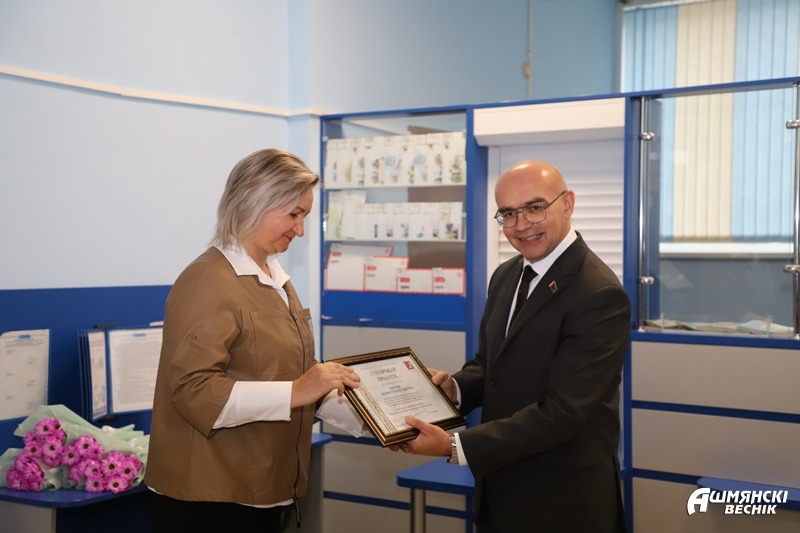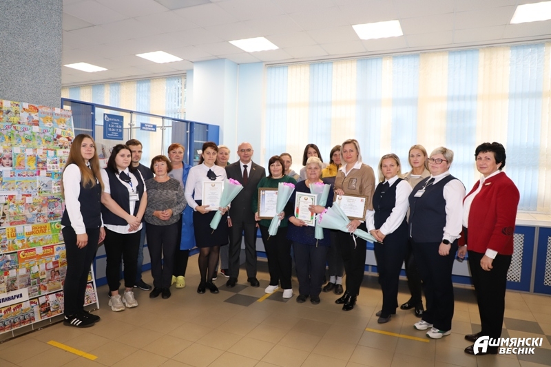 Почетную грамоту Ошмянского райисполкома Юрий Владимирович вручил начальнику Ошмянского участка почтовой связи Лилии Сергей. Почетной грамотой районного Совета депутатов награждена начальник отделения почтовой связи «Крейванцы» Лилия Войнюш. Благодарственное письмо председателя Ошмянского райисполкома принимала оператор связи Ошмянского участка почтовой связи Елена Мадекша, благодарственное письмо председателя районного Совета депутатов вручено почтальону Елене Сенють.