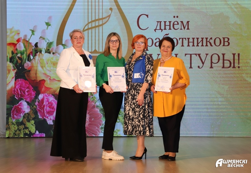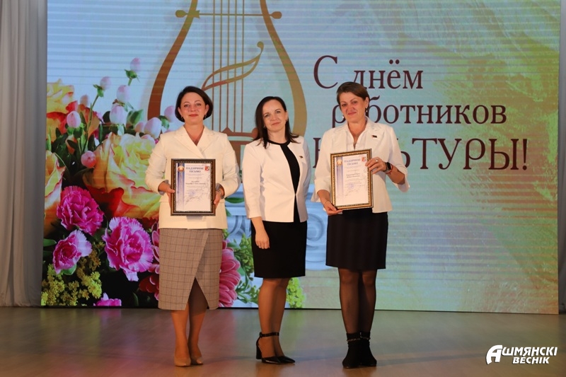 К поздравлениям работникам культуры присоединилась председатель Ошмянской районной организации «Белорусский союз женщин» Марина Куликович, которая вручила Благодарственные письма библиотекарю из агрогородка Кольчуны Елене Шкелде, учителю Гольшанской детской школы искусств Оксане Олешкевич, заведующему сельского клуба агрогородка Кольчуны Снежане Когодовской.