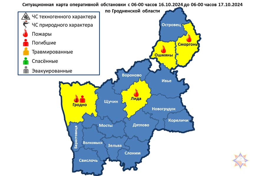 В г. Гродно погиб 1 человек. Ошмянский район — пожар грузового автомобиля, г. Гродно – пожар жилого дома с гибелью человека, г. Гродно — пожар в мусороприемной камере, г. Лида — пожар легкового автомобиля, г. Сморгонь — пожар хозяйственной постройки.