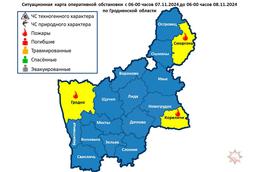 Произошло 3 пожара: Гродненский район — пожар жилого дома, Кореличский район — пожар жилого дома, г. Сморгонь – загорание легкового автомобиля. Люди не пострадали.