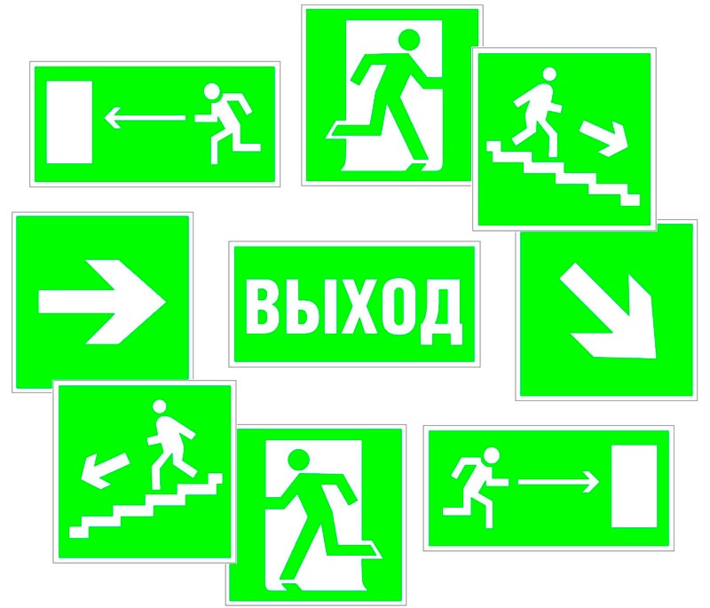 Пути эвакуации и эвакуационные выходы обозначаются знаками на зеленом фоне, которые указывают кратчайший путь к выходу.