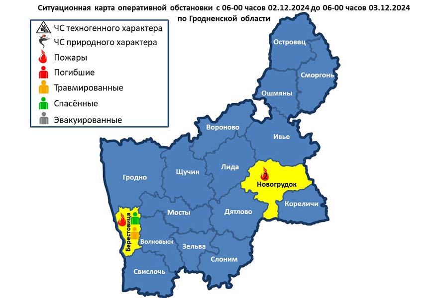 Произошло 3 пожара, на которых спасен 1 человек, пострадал 1 человек: в г. Новогрудок – пожар хозяйственной постройки, в Новогрудском районе – пожар жилого дома, в Берестовицком районе – пожар в жилом доме со спасенным -травмированным.