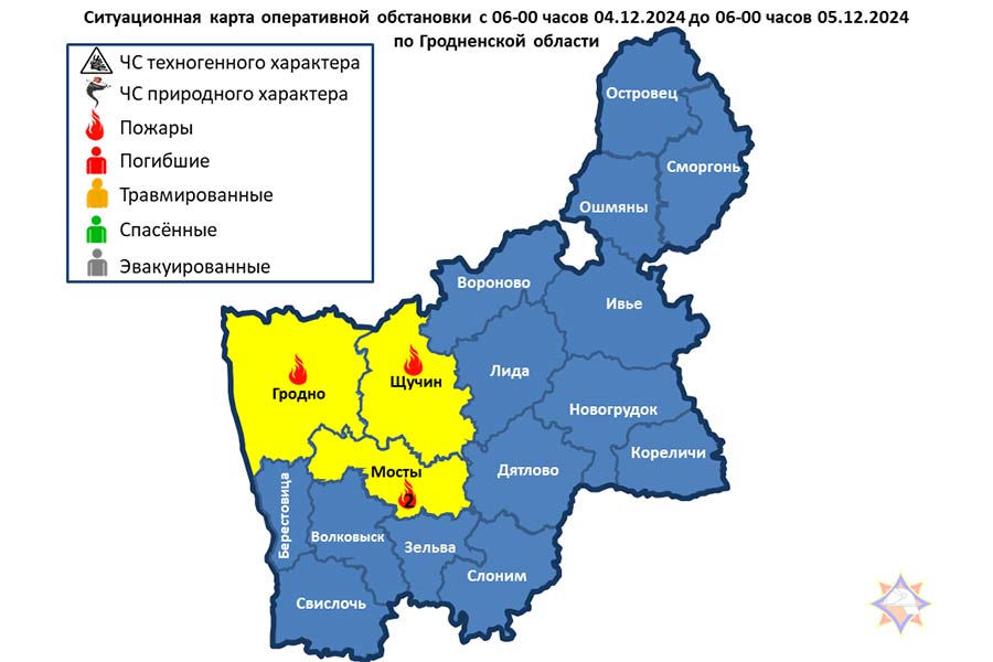 За прошедшие сутки на территории Гродненской области произошло 4 пожара: г. Гродно – пожар в квартире, Щучинский район – пожар нежилого дома, г. Мосты – пожар хозяйственной постройки, Мостовский район – пожар магазина. Люди не пострадали.