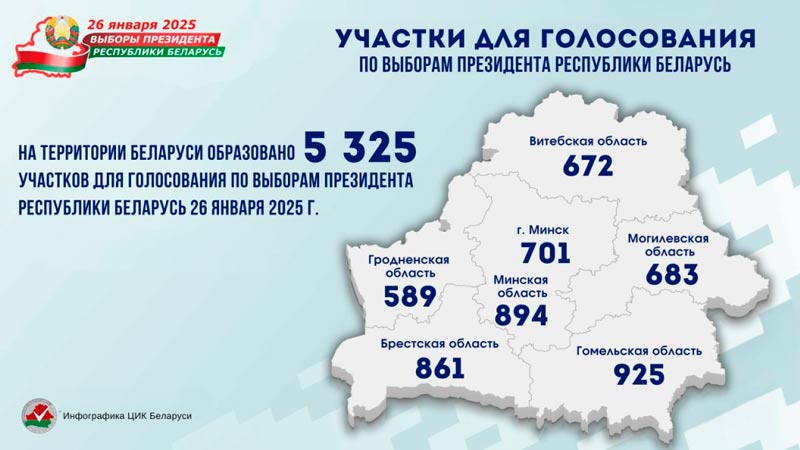 ЦИК сообщает, что наибольшее число участков для голосования сформировано в Гомельской и Минской областях (925 и 894 соответственно), 861 — в Брестской области, 701 — в г. Минске, 683 — в Могилевской области, 672 — в Витебской области и 589 — в Гродненской области.