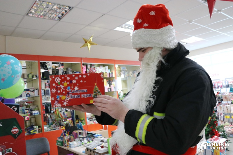 Сотрудник РОЧС в костюме Деда Мороза напоминает ребятам о правилах безопасности, хотя покупатели, оказывается, и сами знают, как пользоваться петардами, которые они решили приобрести в магазине. Эту информацию при покупке пиротехники всегда доводит и продавец.