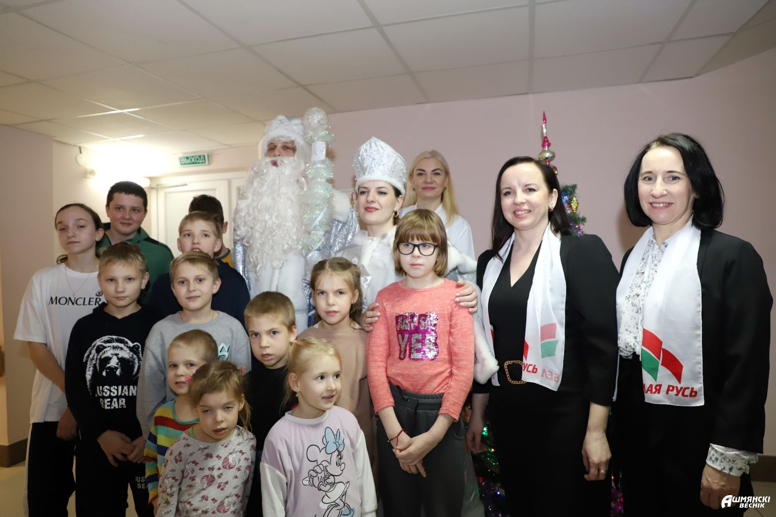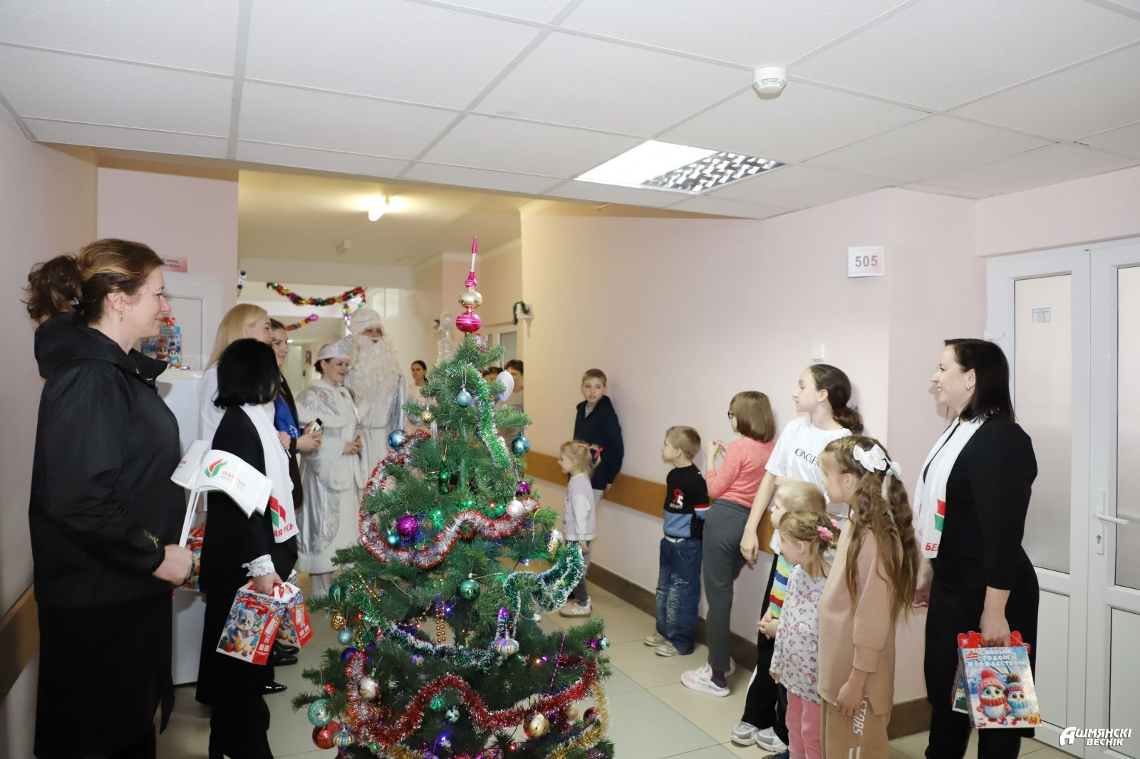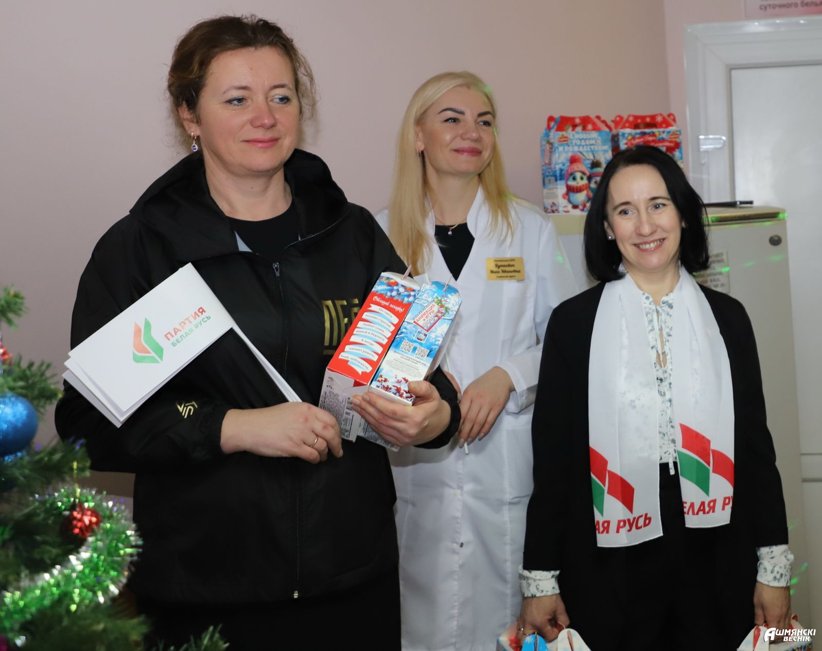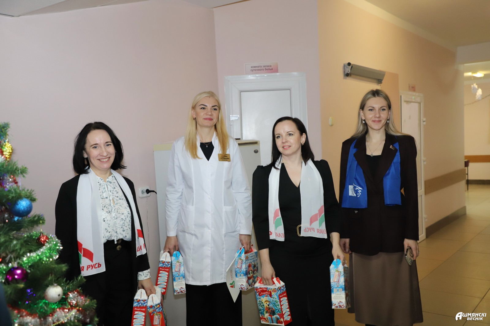 Благотворительная акция «Наши дети» продолжается по всей стране. В канун Нового года в детское отделение Ошмянской районной больницы поздравить ребят с наступающими праздниками приехали заместитель председателя Ошмянского райисполкома Анна Язель, председатель совета Ошмянского районного отделения Белорусской партии «Белая Русь» Светлана Барковская, заместитель председателя районной организации РОО «Белая Русь» Ольга Саванец, активист районной организации ОО «Белорусский союз женщин» Екатерина Толочко.
