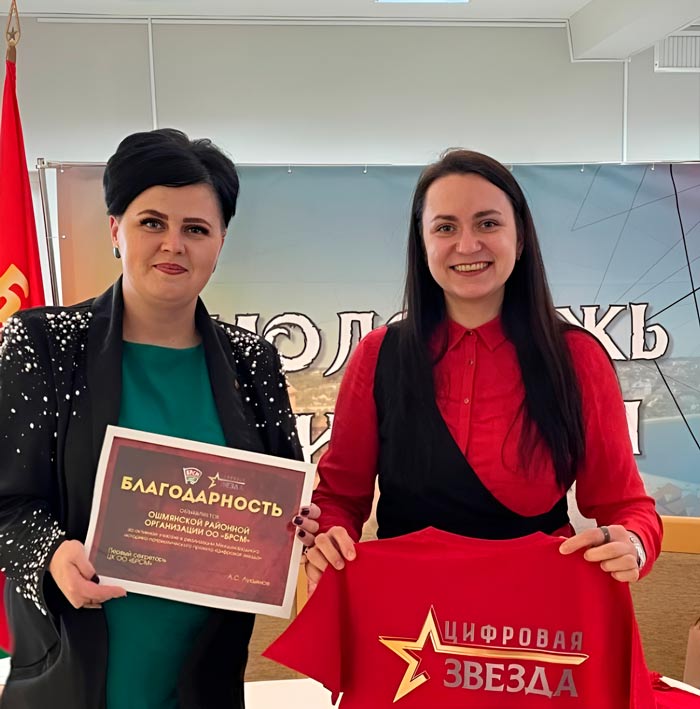 В рамках областного молодежного медиафорума «Медиа-Лаборатория: создаем будущее вместе» были подведены итоги, а самые активные – награждены благодарственными письмами. За активное участие в реализации международного историко-патриотического проекта центральный комитет ОО «БРСМ» отметил и Ошмянский район. Первый секретарь райкома Юлия Субач принимала награду и поздравления.