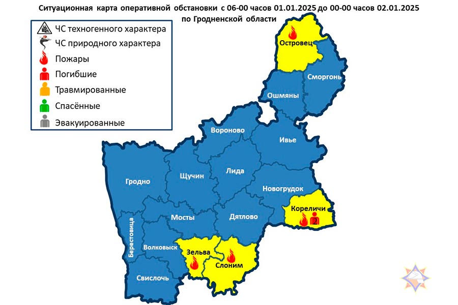 Произошло 4 пожара: в Зельвенском районе – пожар в нежилом доме, в Островецком районе – пожар частной бани, в Слонимском районе – пожар жилого дома, в Кореличском районе – пожар в жилом доме с гибелью 2 человек.