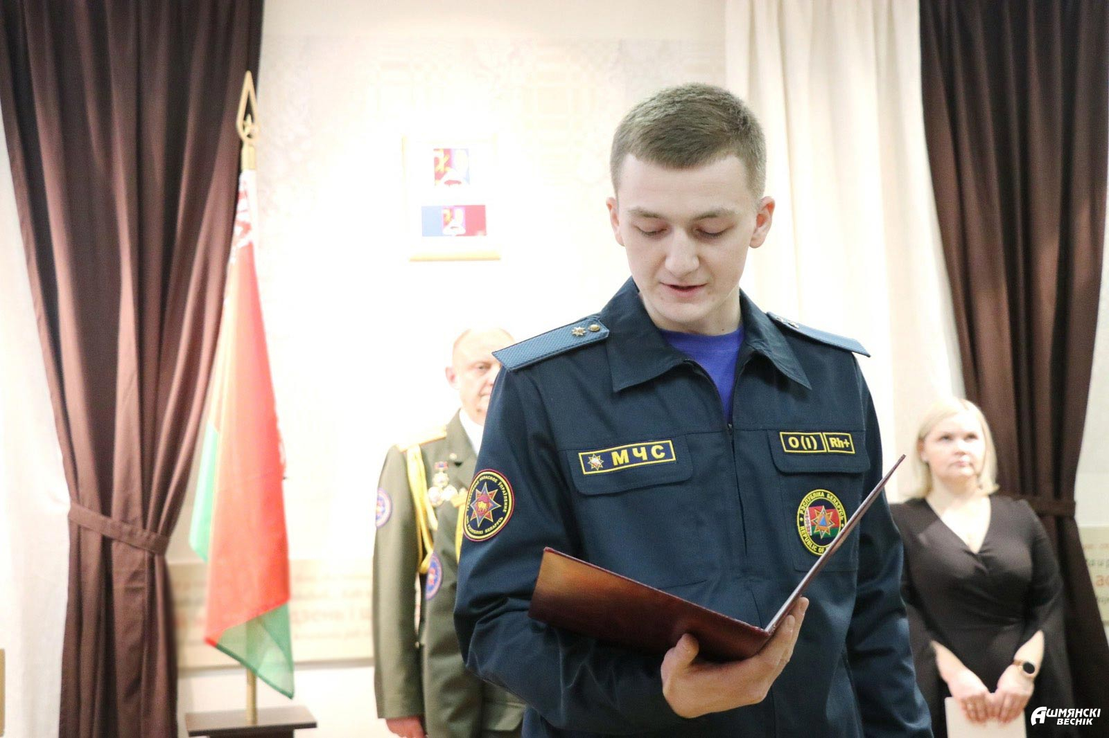 Торжественная церемония принесения присяги на верность Республике Беларусь и ее народу новобранцами Ошмянского РОЧС состоялась в Ошмянском краеведческом музее имени Франтишка Богушевича. По сложившейся традиции – в преддверии профессионального праздника – торжественную клятву произнесли пожарные-спасатели пожарной аварийно-спасательной части № 1 Александр Жуковский, Дмитрий Новогроцкий и водитель Матвей Станкевич.