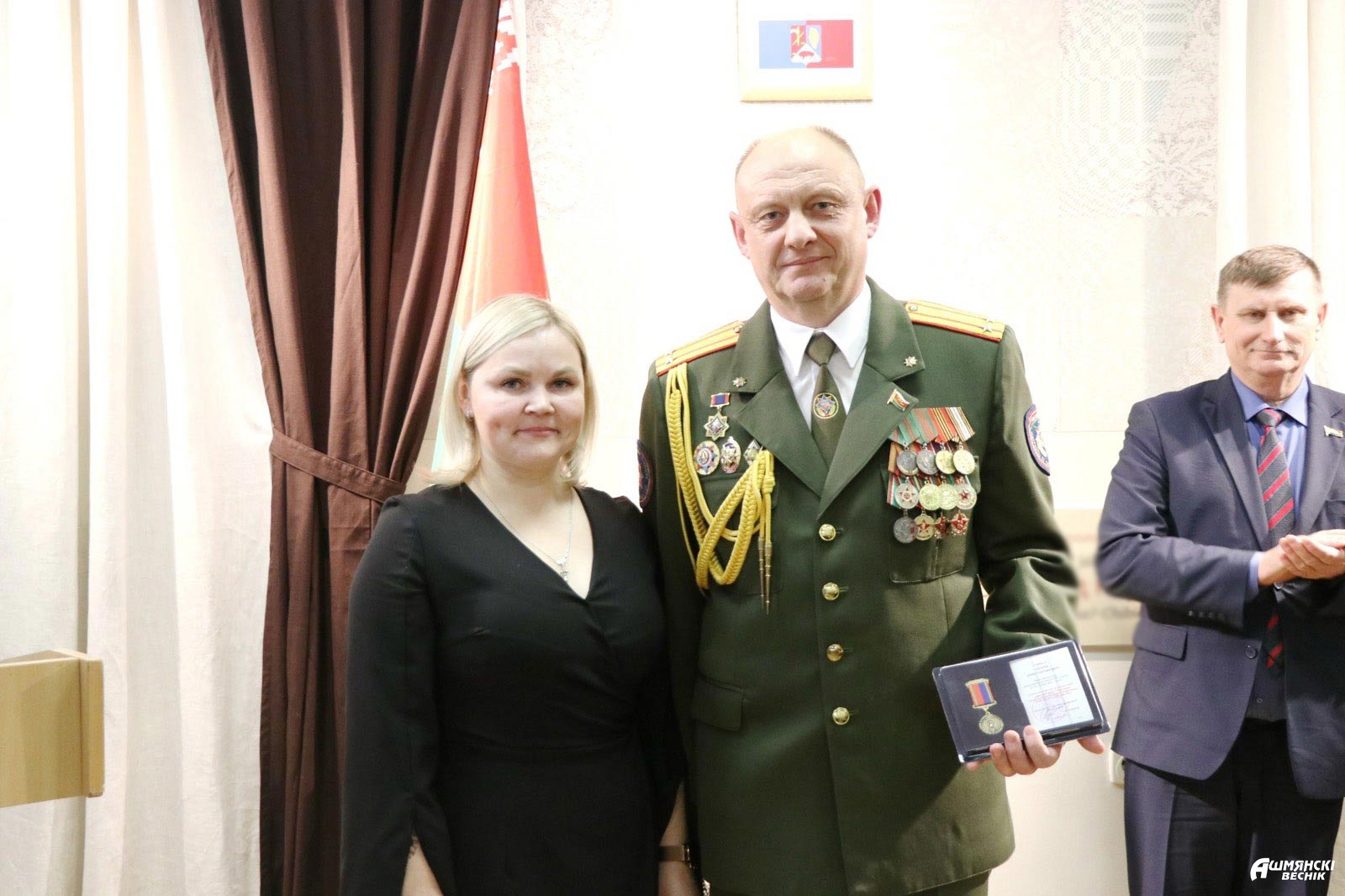 К поздравлениям присоединилась исполняющая обязанности начальника Ошмянского производственного участка Гродненского областного комбината противопожарных работ Лилия Селистровская, которая вручила памятный нагрудный знак «100 год з дня стварэння Усебеларускага дабравольнага пажарнага таварыства» начальнику Ошмянского РОЧС Андрею Горбачу.