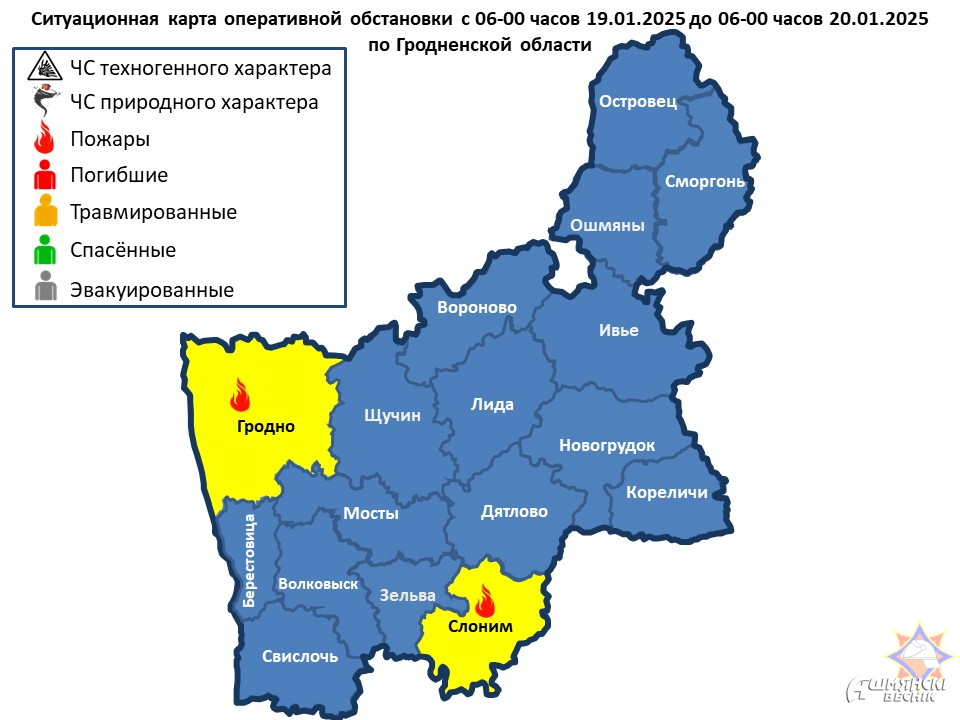 За прошедшие сутки на территории Гродненской области произошло 2 пожара: в г. Гродно (Ленинский район) – пожар в квартире, в г. Слоним – пожар легкового автомобиля. Люди не пострадали.