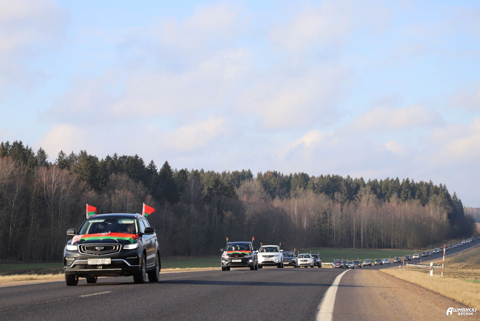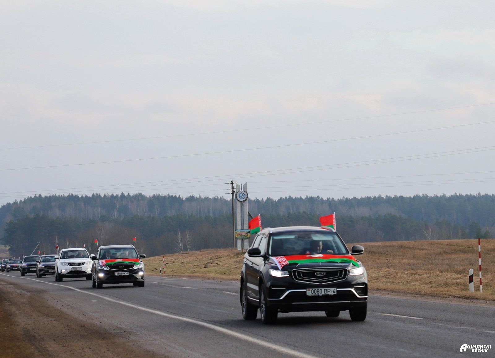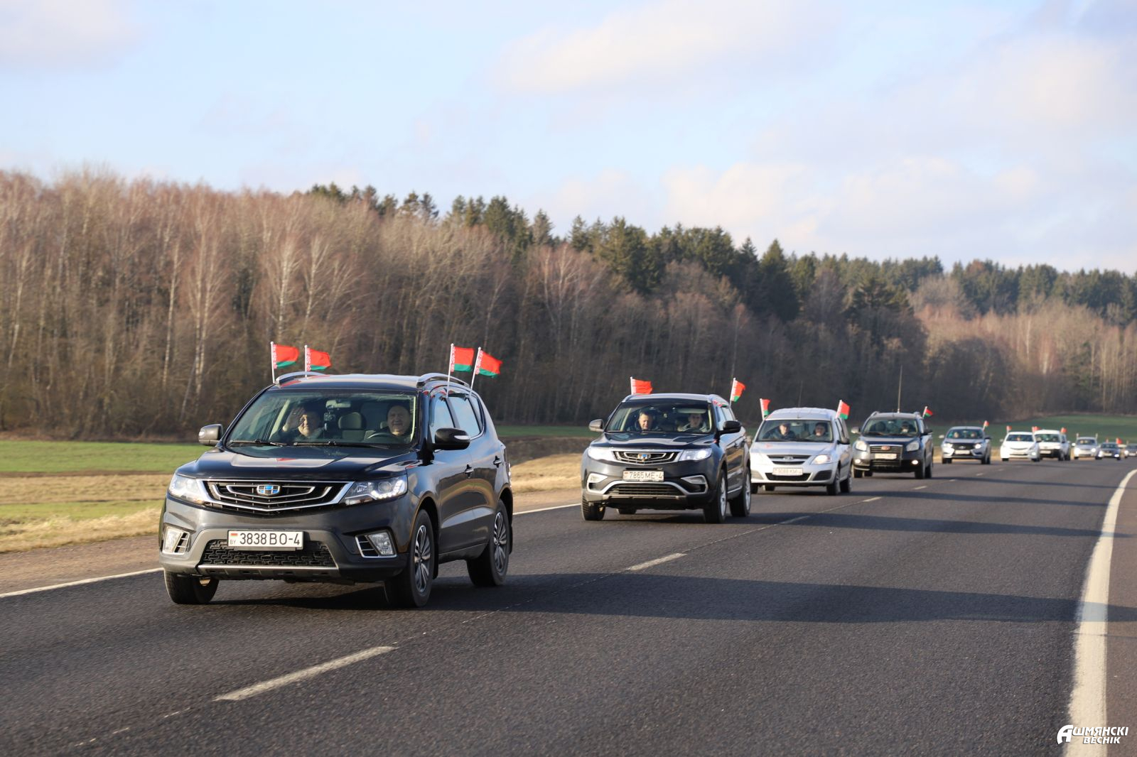 В поддержку результатов выборов колонна из 87 автомобилей с государственными флагами проехала по маршруту Ошмяны – Гольшаны – Боруны – Каменный Лог – Ошмяны, охватив тем самым практически весь район.