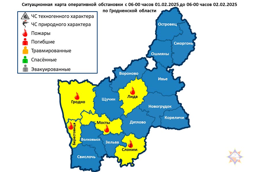 Произошло 6 пожаров: в г. Гродно (Ленинский район) – пожар в административном здании, в Берестовицком районе – пожар нежилого дома, в Лидском районе – пожар бани, в г. Слоним – пожар жилого дома, в г. Слоним – пожар бытовки, Мостовском районе – пожар хозяйственной постройки. Люди не пострадали.
