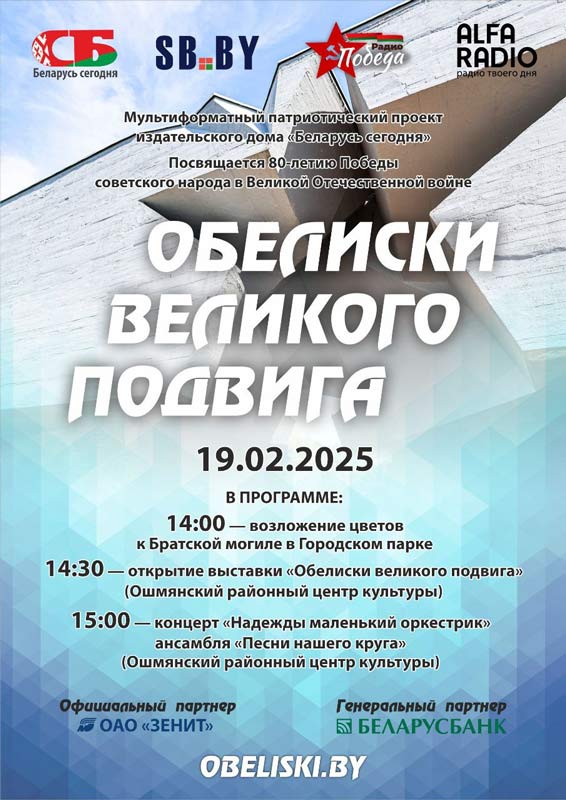 19 февраля познакомиться с проектом смогут и ошмянцы. В программе мероприятия: в 14.00 – возложение цветов к братской могиле в городском парке; 14.30 – открытие выставки (Ошмянский районный центр культуры); 15.00 – концерт «Надежды маленький оркестрик» ансамбля «Песни нашего круга» (Ошмянский районный центр культуры).