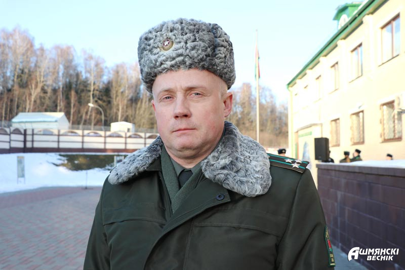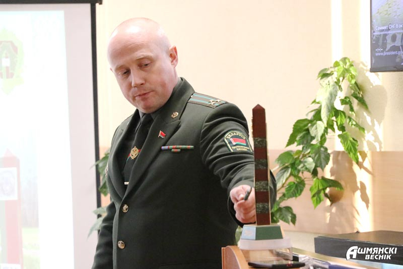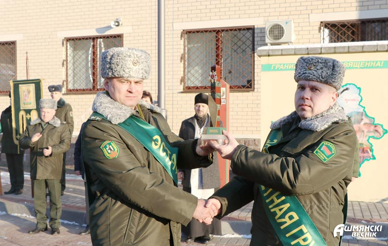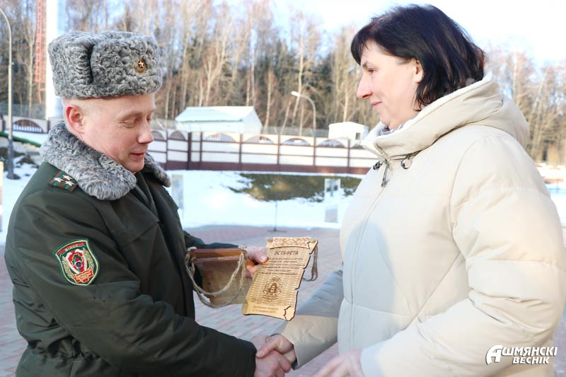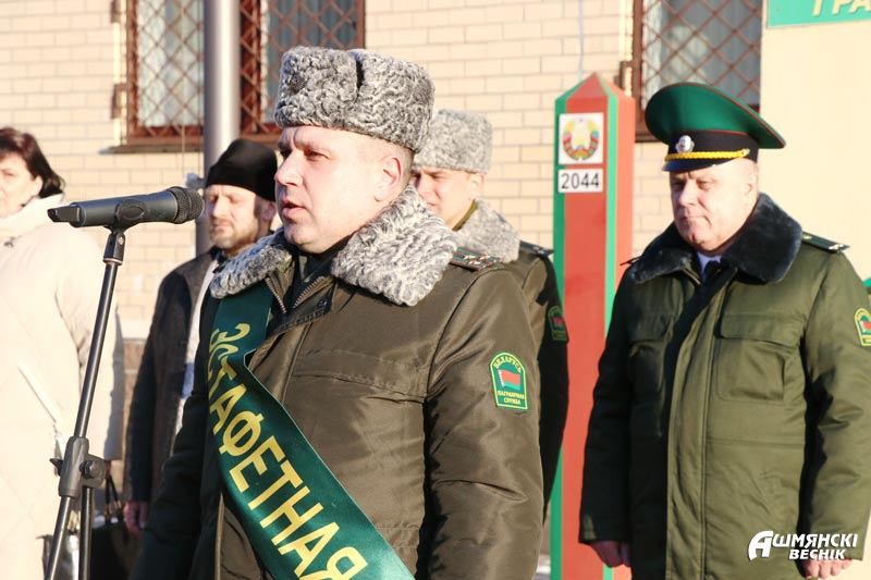 В торжественной обстановке заместитель начальника Лидского пограничного отряда полковник Виктор Стома передал символ эстафеты участнику эстафетной группы, заместителю начальника Сморгонской пограничной группы полковнику Игорю Мельнику.