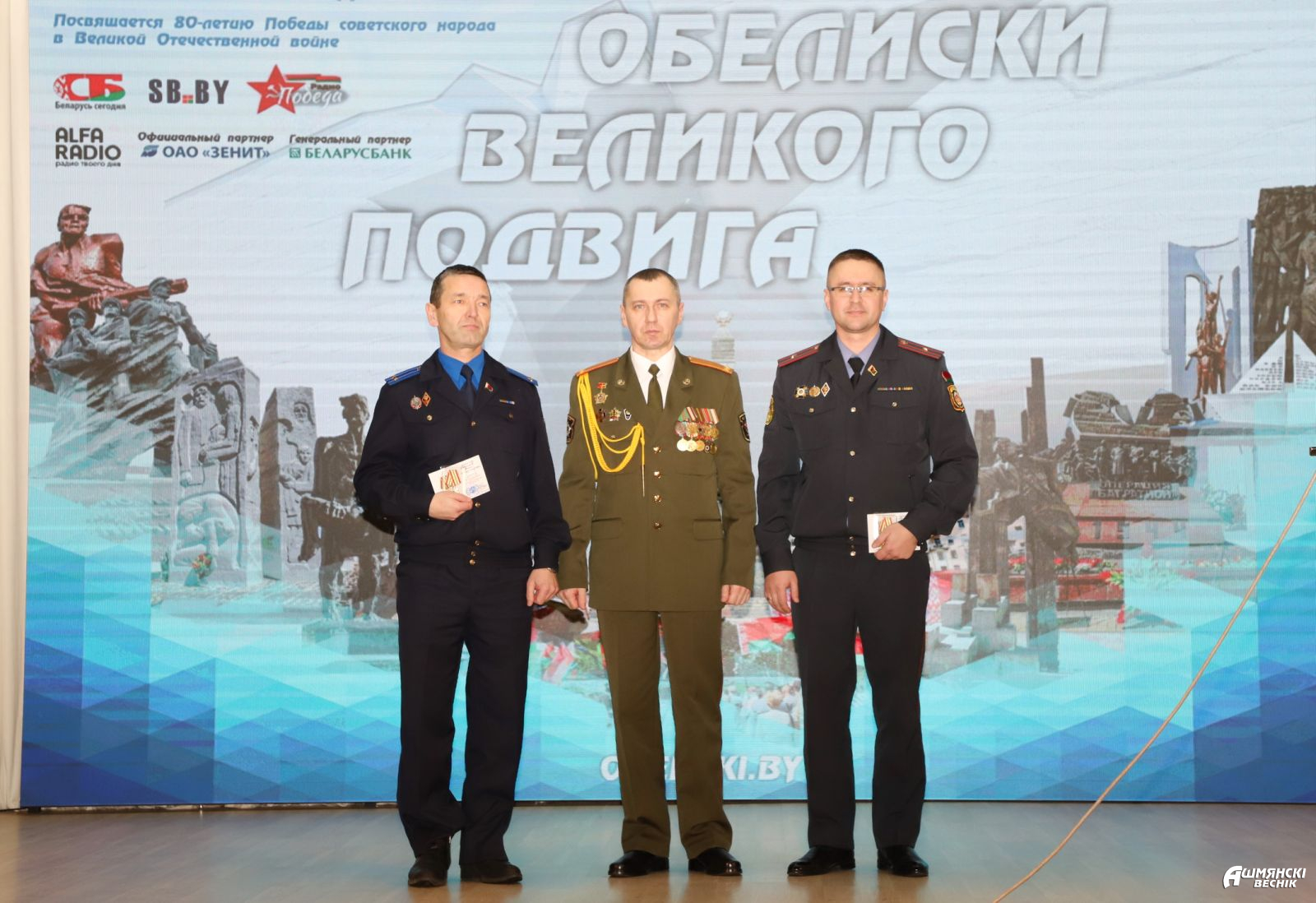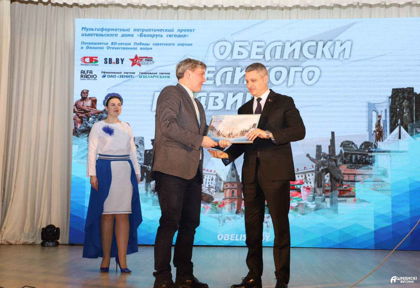 Ошмянцев приветствовал также начальник управления издательского дома «Беларусь сегодня», организатор проекта «Обелиски великого подвига» Павел Сухоруков. Он отметил, что, только преклоняясь перед подвигом предков, можно иметь вакцину от войны в будущем. Павел Яковлевич вручил председателю Ошмянского райисполкома Владиславу Гершгорину памятный знак проекта «Обелиски великого подвига».