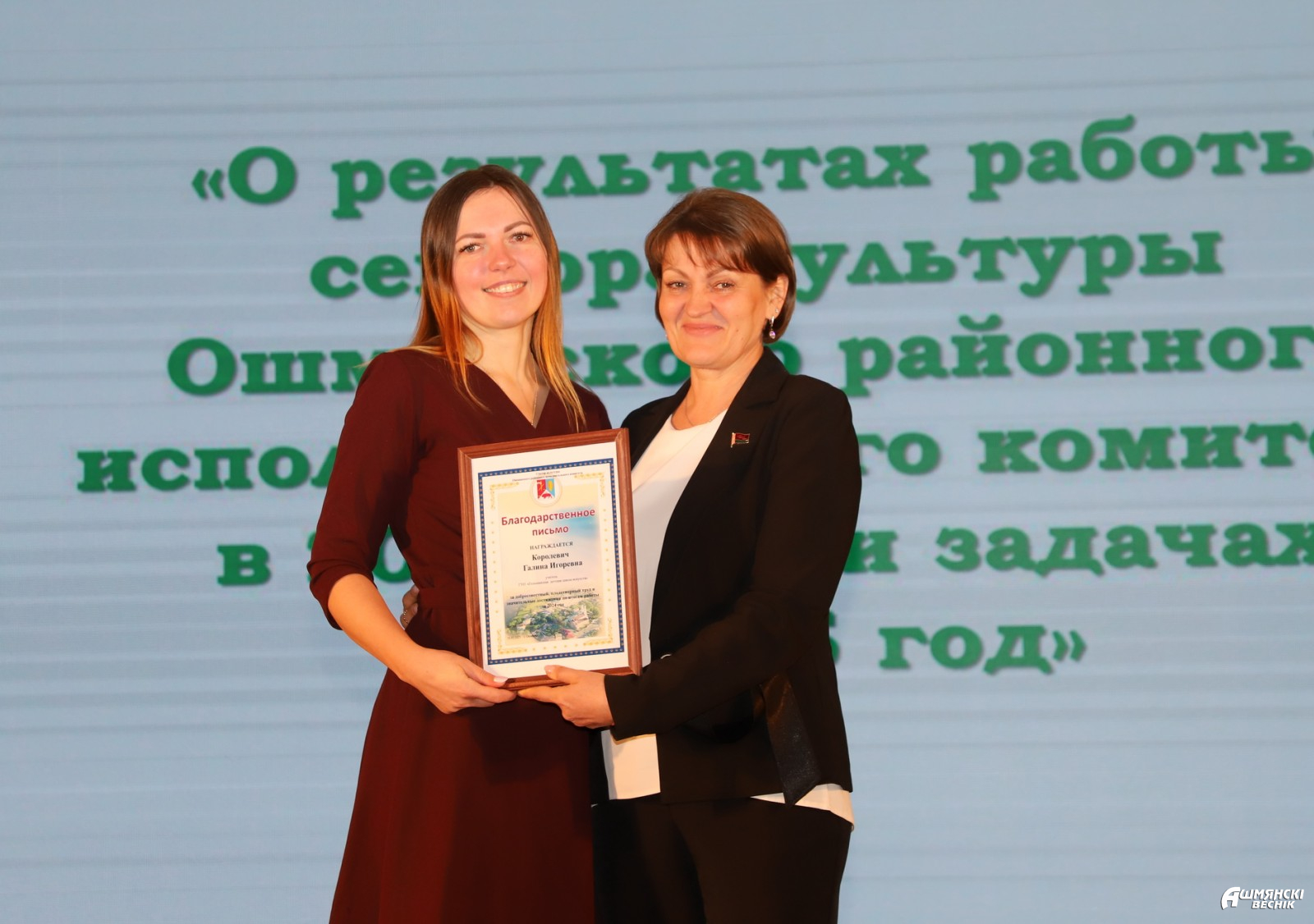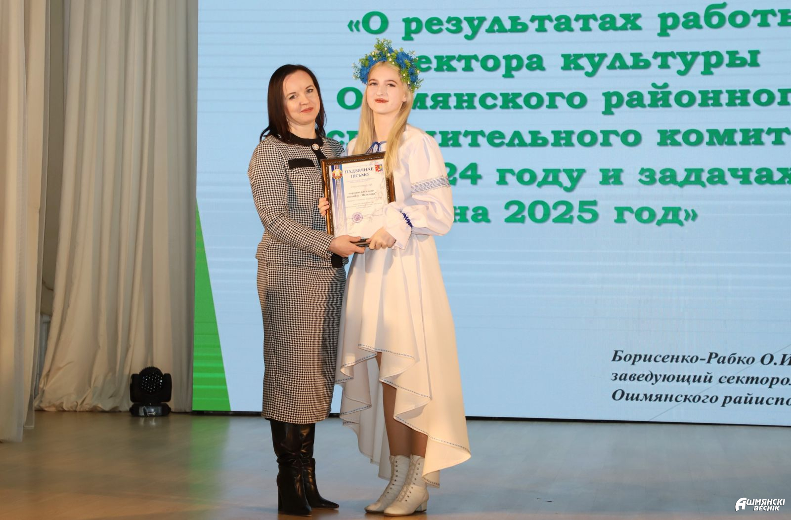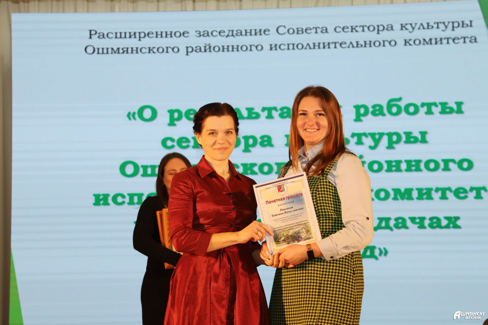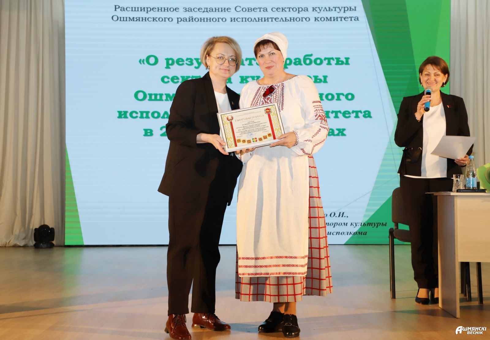 В завершение мероприятия состоялось награждение представителей учреждений культуры по итогам работы за 2024 год. Благодарность Министра культуры Республики Беларусь объявлена директору Ошмянской районной библиотеки Марине Белоус. Благодарственным письмом председателя Ошмянского райисполкома отмечена активная концертная деятельность народного театра танца и песни «Импульс» под руководством Марины Воронович и народного вокального ансамбля «Мельница», которым руководит Анастасия Станкевич. Почетной грамотой управления культуры Гродненского облисполкома награждены заведующий отделом ремесел и традиционной культуры Валентина Свирская и заведующий сельским клубом д. Гроди Станислава Томашевич.