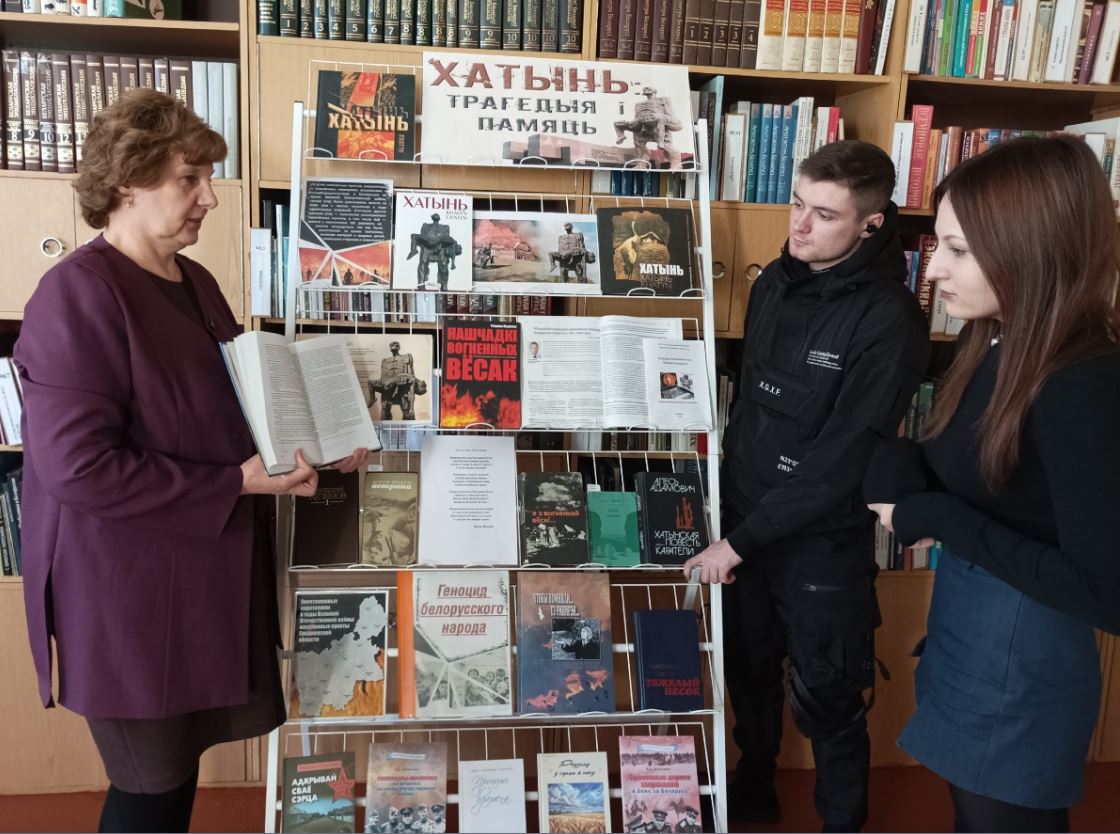 У чытальнай зале бібліятэкі аформлена кніжная выстава “Хатынь: трагедыя і памяць”, на якой прадстаўлены кнігі, ілюстраваныя альбомы, дакументальна-публіцыстычныя матэрыялы, ксеракопіі, мастацкія творы, прысвечаныя Хатынскай трагедыі. Сярод экспануемых выданняў – кнігі “Хатынь” (укладальнік Наталля Кірылава), “Хатынь. Трагедыя беларускага народа” (Артур Зельскі), аповесці Алеся Адамовіча “Карнікі”, “Хатынская аповесць”, зборнік Алеся Адамовіча, Янкі Брыля, Уладзіміра Калесніка “Я з вогненнай вёскі…” і іншыя.