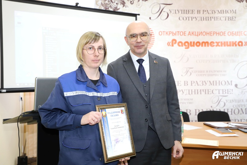 В рамках встречи, проходившей в ОАО «Радиотехника», заместитель председателя Ошмянского райисполкома Юрий Снесарь вручил Благодарственное письмо председателя Ошмянского райисполкома слесарю механосборочных работ Елене Бутрим, которую отличает добросовестный труд и активное участие в общественно-политической жизни.