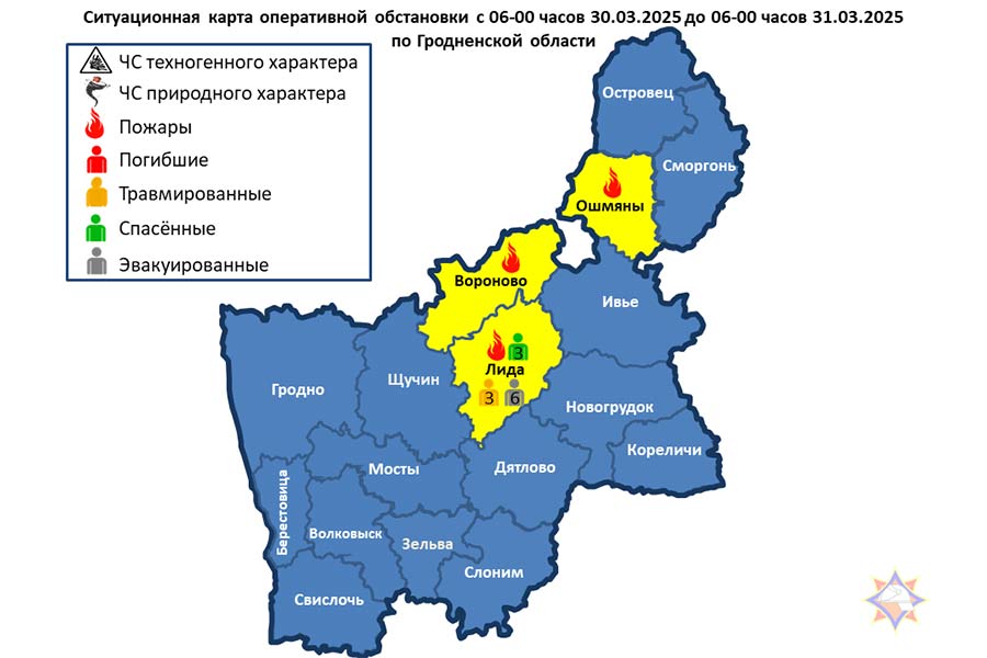 За прошедшие сутки на территории Гродненской области произошло 3 пожара, 3 человека спасено, 3 человека травмировано, 6 человек эвакуировано: в г. Лида – пожар в квартире со спасенными, травмированными и эвакуированными, в Ошмянском районе – пожар автомобиля, в Вороновском районе – пожар нежилого дома.