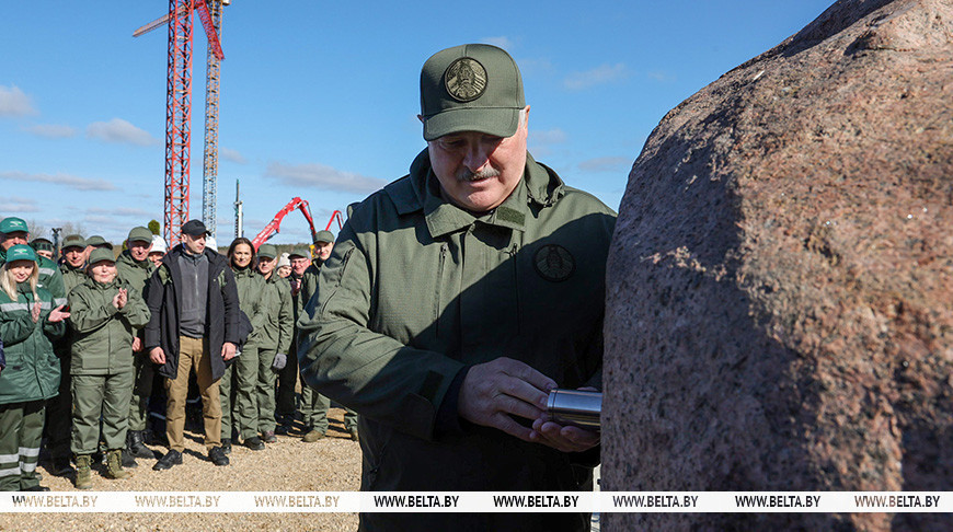 Главу государства встретили представители Белорусского республиканского союза молодежи, которые передали ему капсулу с посланием. В торжественной обстановке Александр Лукашенко заложил его в камень.