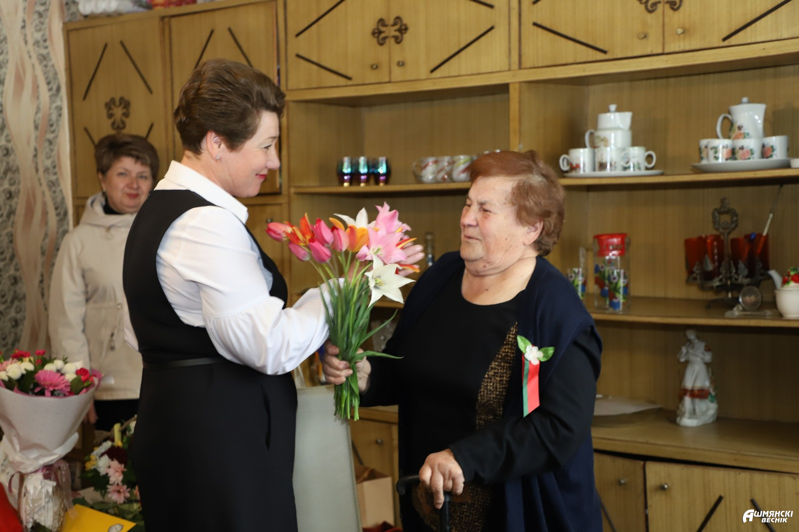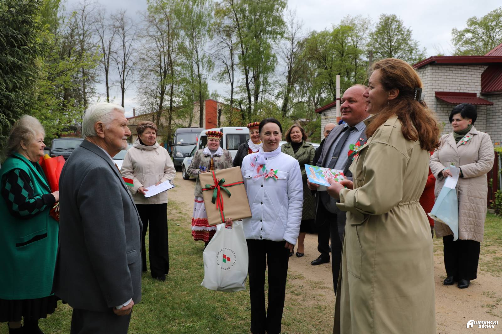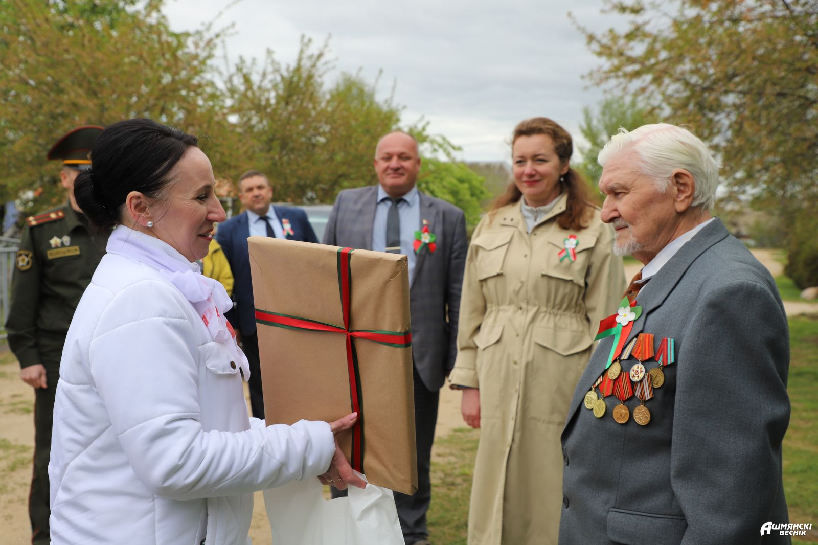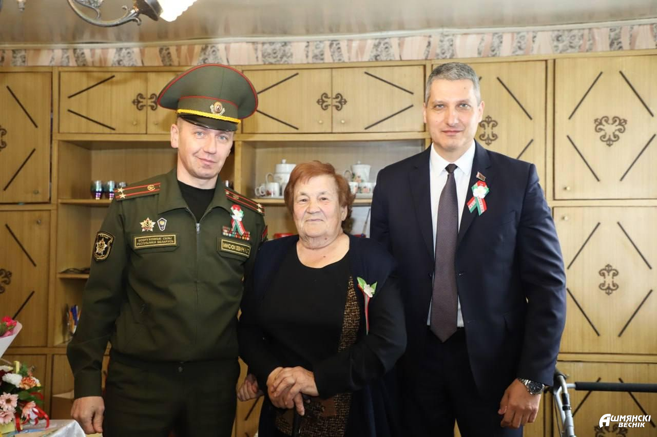 К поздравлениям присоединились военный комиссар Ошмянского района Игорь Мисюкевич, председатель районного совета ветеранов Владимир Бельченко, начальник управления по труду, занятости и социальной защите райисполкома Ирина Губарева, представители районного отделения Белорусской партии «Белая Русь», районных организаций РОО «Белая Русь», «Белорусский союз женщин», «БРСМ», Белорусского фонда мира, лидеры отраслевых профсоюзных организаций, депутатский корпус.