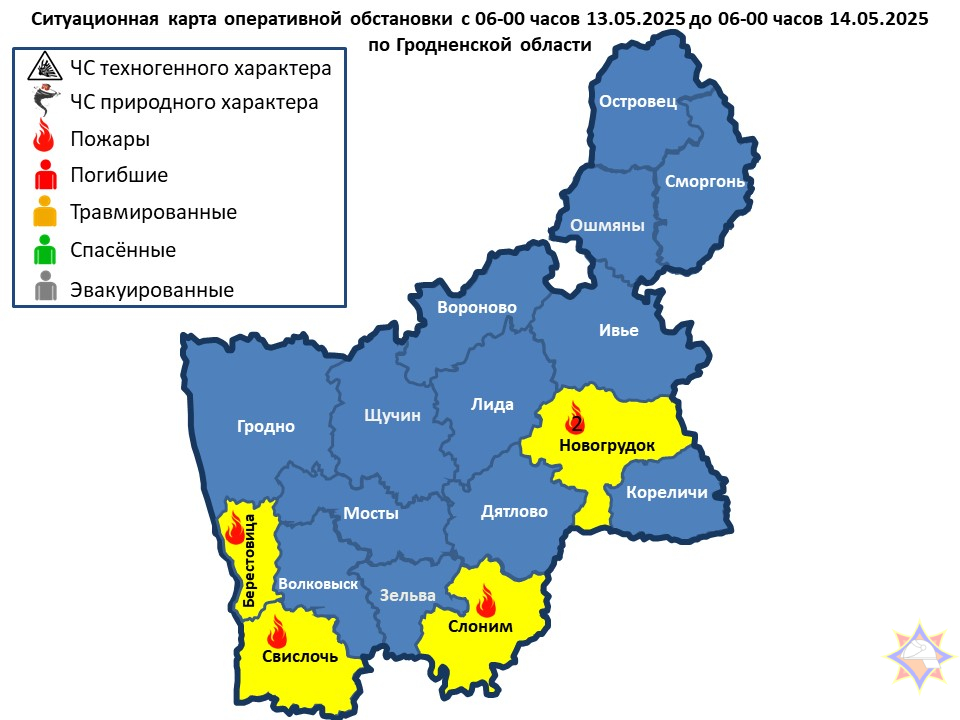 За сутки подразделениями МЧС области совершено 46 выездов, из них: 5 – пожары: Слонимский район – пожар соломы, Новогрудский район – пожар хозяйственной постройки, Новогрудский район – пожар в жилом доме, Берестовицкий район – пожар гаража, Свислочский район – пожар жилого дома. Люди не пострадали.