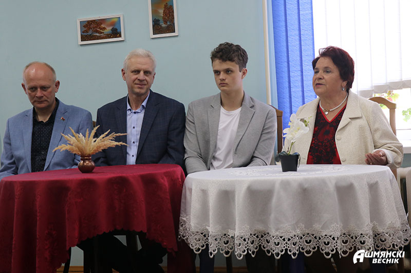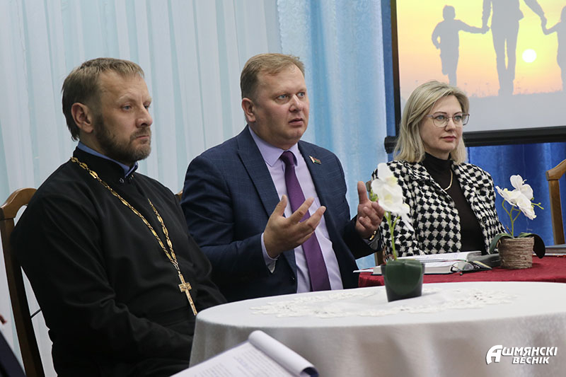 После Виталий Николаевич принял участие в диалоговой площадке «Все начинается с семьи», которая прошла на базе отделения дневного пребывания для граждан пожилого возраста Ошмянского ТЦСОН. На мероприятие также были приглашены и другие гости: настоятель храма Воскресения Христова Георгий Муха, начальник отдела ЗАГС Ошмянского райисполкома Инна Подъельская, члены совета пожилых граждан Елена Шкелда и Наталья Кононович, семья Гайдукевич, перешагнувшая 50-летний юбилей совместной жизни, многодетная мама Вероника Пашкевич, а также посетители отделения и учащиеся СШ№ 2.