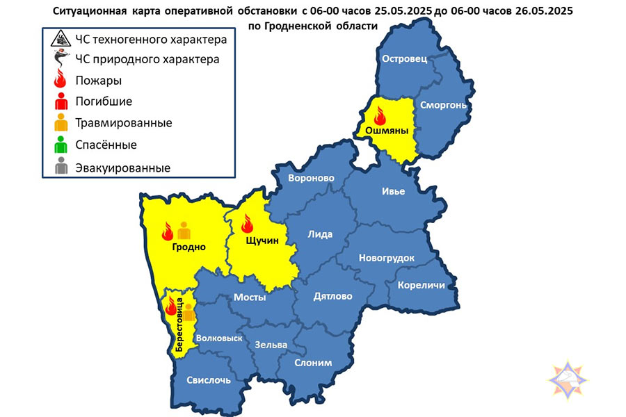 За сутки подразделениями МЧС области совершено 26 выездов, из них: 4 – пожары: Ошмянский район – пожар хозяйственной постройки, Щучинский район – пожар в жилом доме, Берестовицкий район – пожар одежды, травмирован 1 человек (ребенок), г. Гродно (Октябрьский район) – пожар в квартире, травмирован 1 человек.