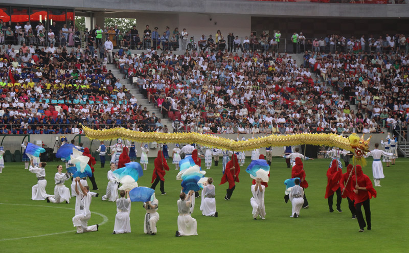 Торжественное открытие началось с выноса государственных флагов и исполнения гимнов Беларуси и Китайской Народной Республики. Церемония получилась настоящим праздником двух культур. На ней было место и белорусскому колориту, и китайскому дракону. Выступления артистов звучали на двух языках.
