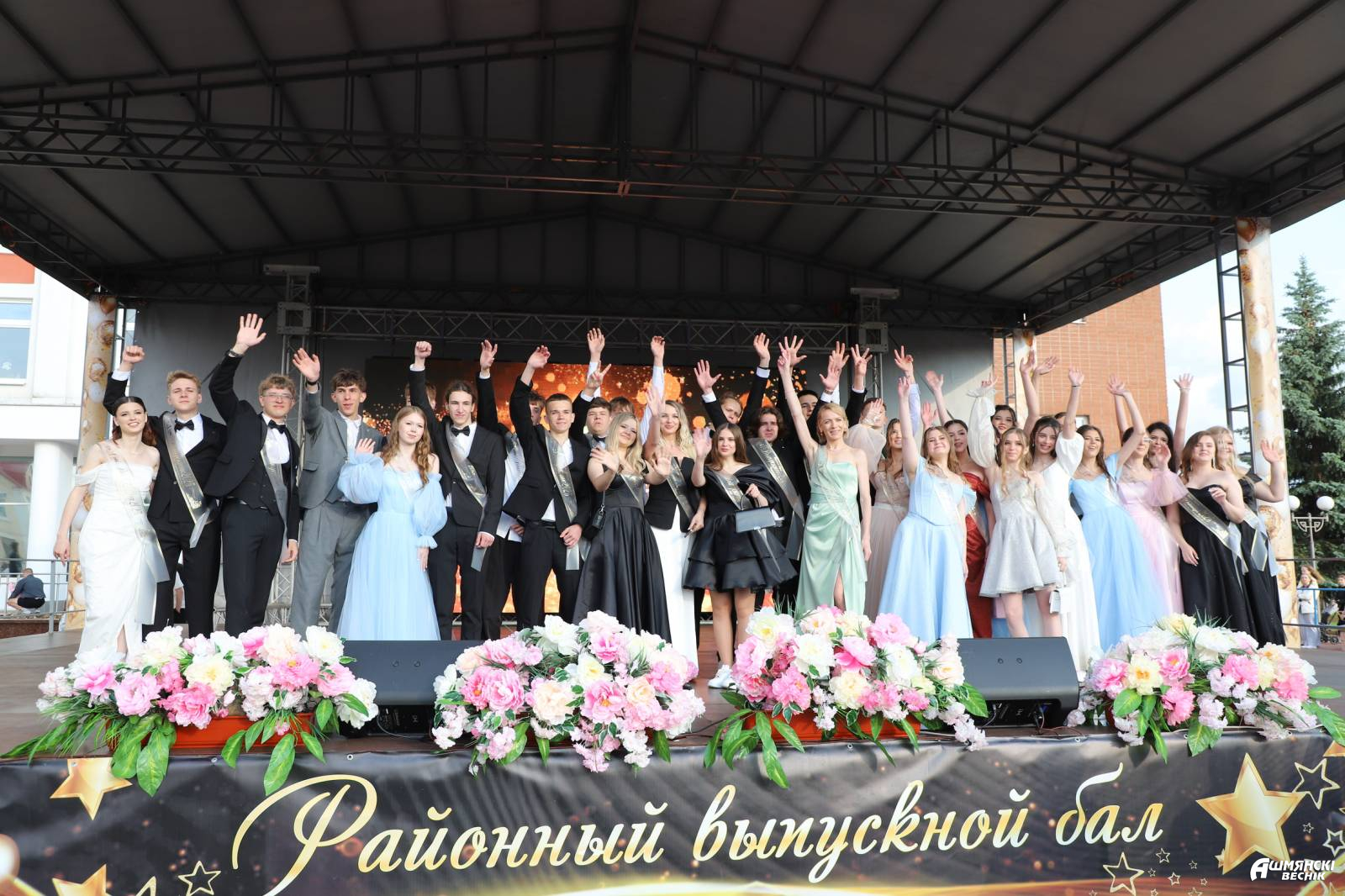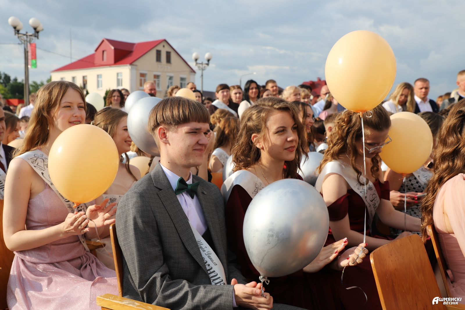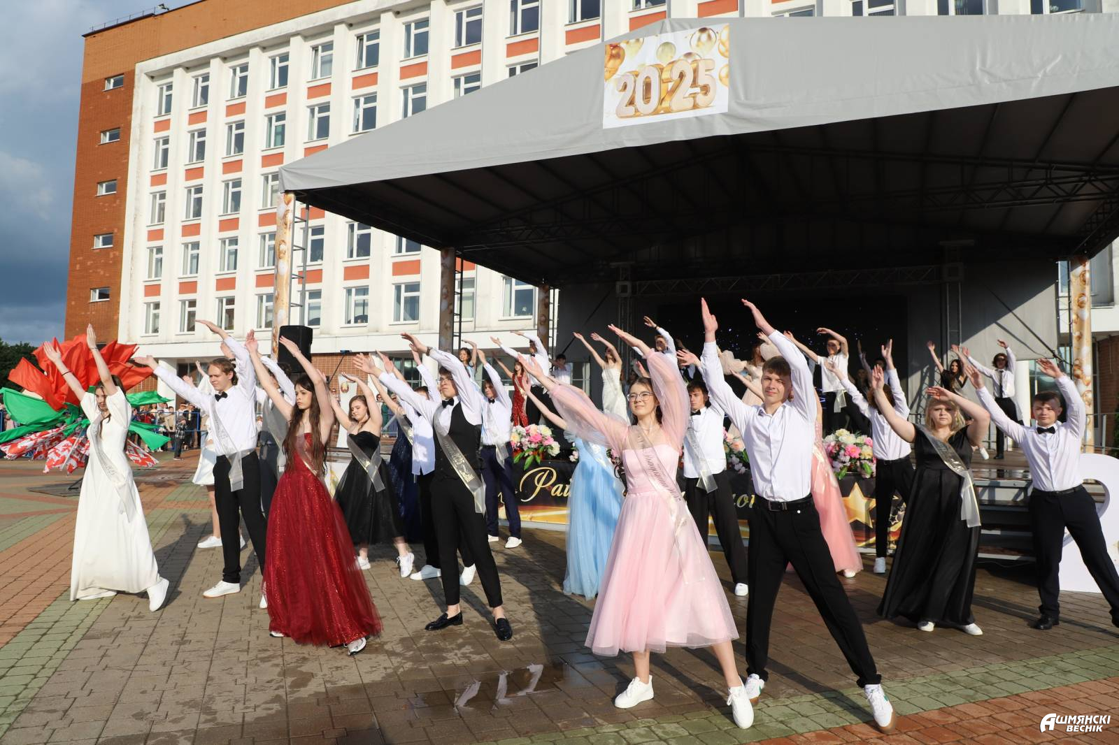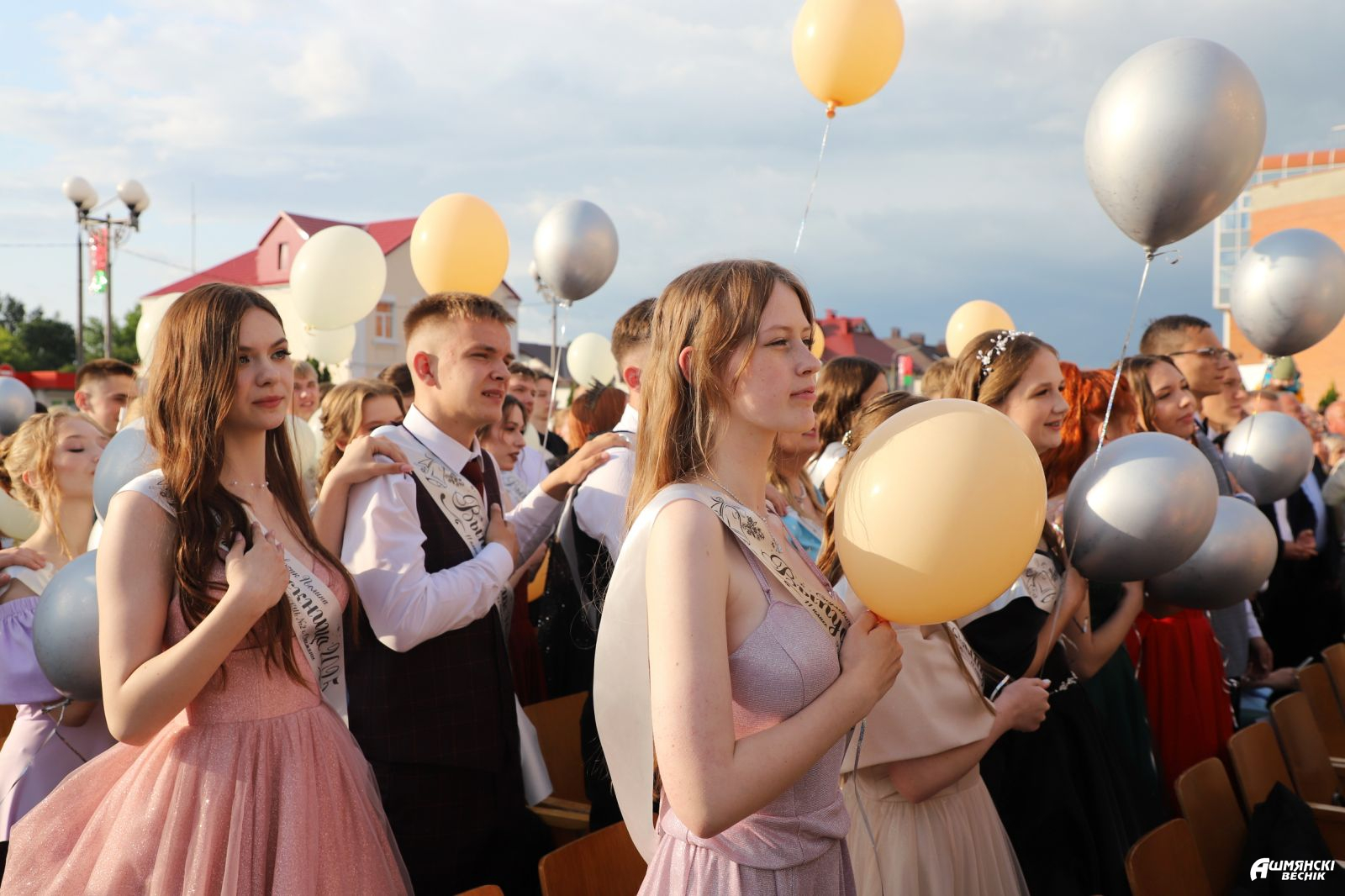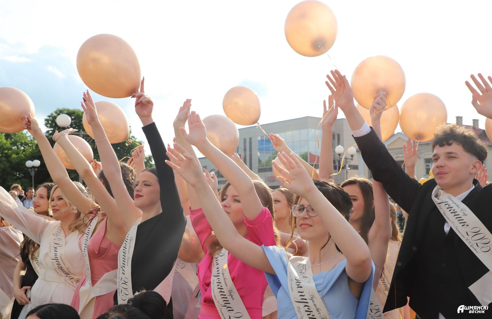 Выпускники раскрасили городскую площадь разноцветьем праздничных нарядов, ослепительными улыбками, юностью и энергией. Бурными овациями встречали ошмянцы каждый выпускной класс.