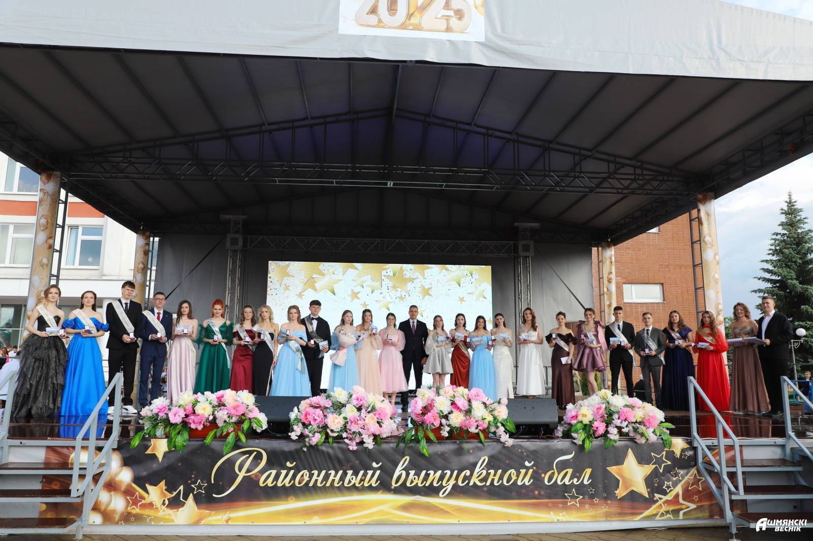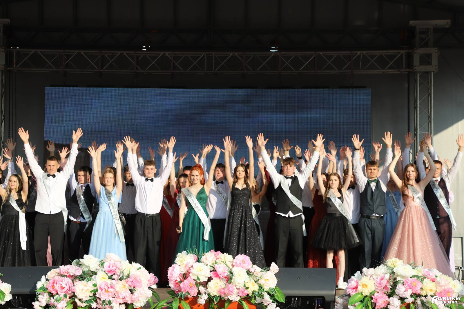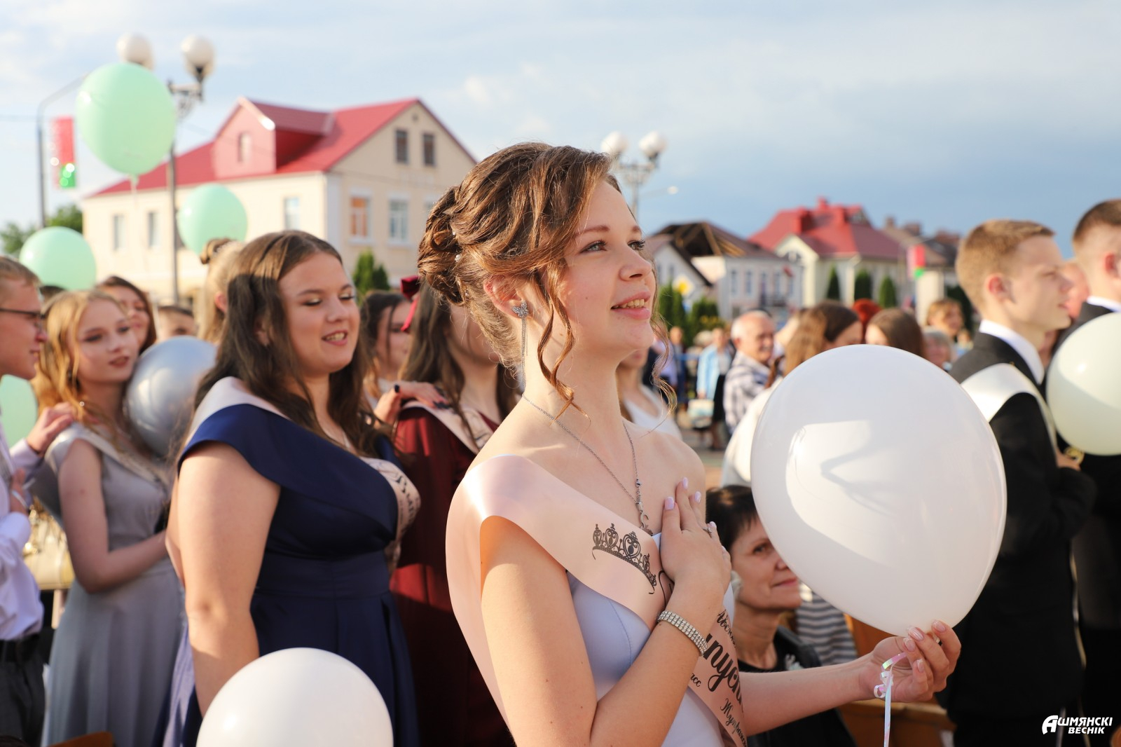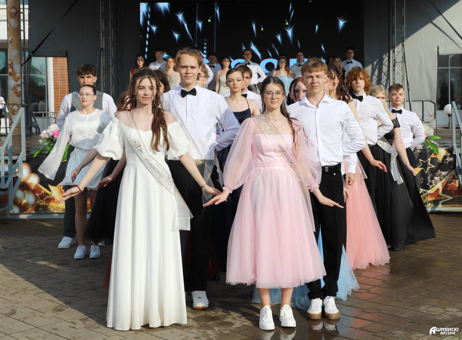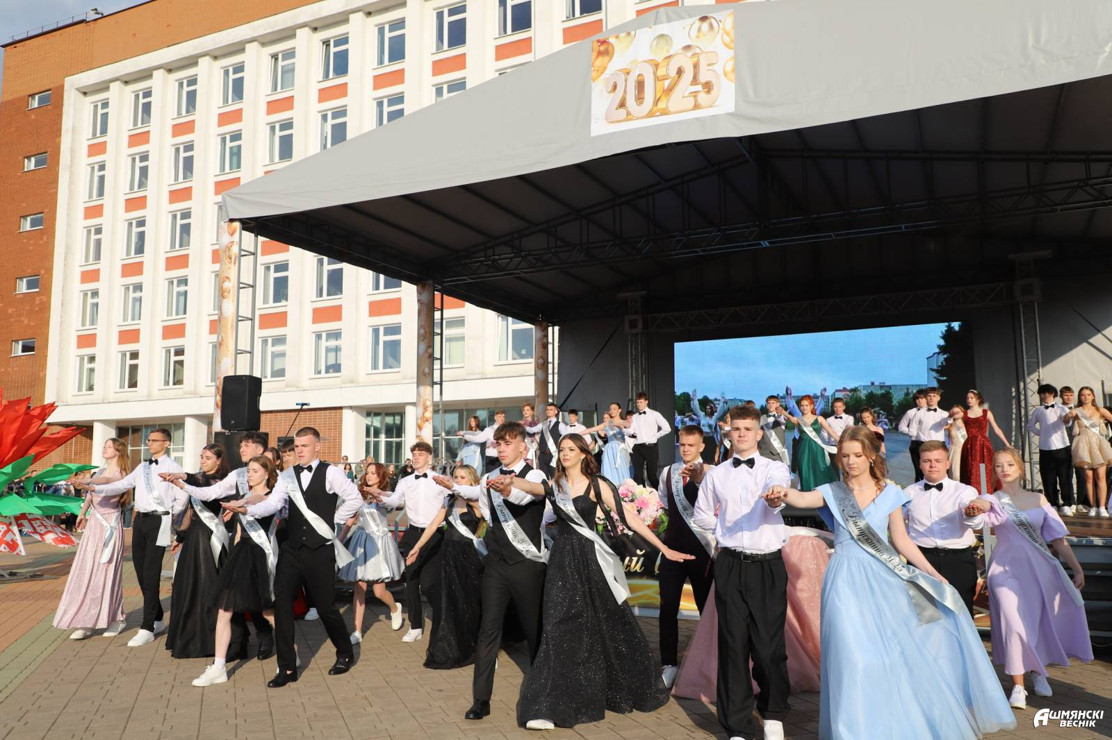 Выпускники раскрасили городскую площадь разноцветьем праздничных нарядов, ослепительными улыбками, юностью и энергией. Бурными овациями встречали ошмянцы каждый выпускной класс.